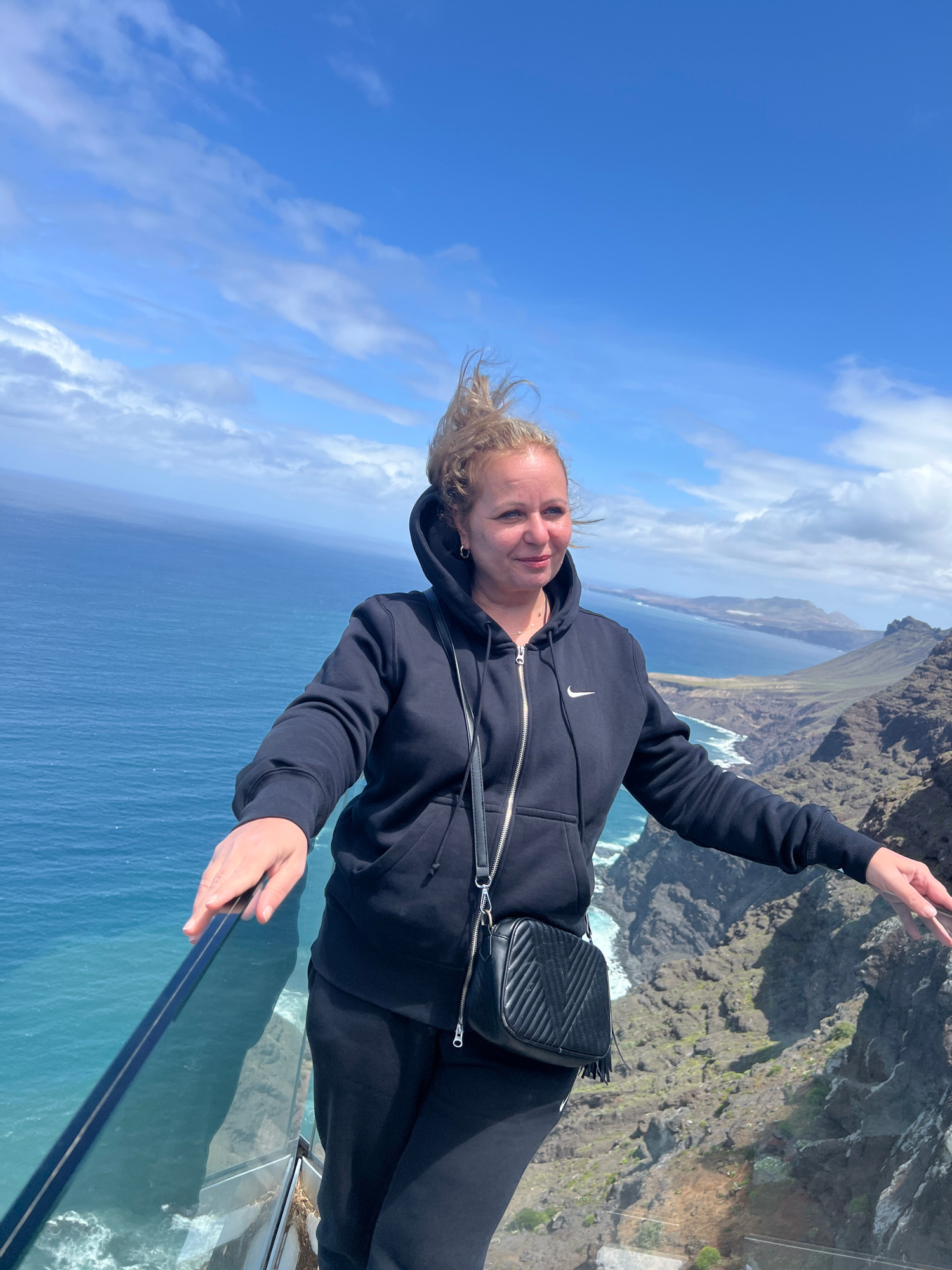 The image shows a woman standing on a glass platform overlooking a cliff and the ocean in Tirma, Spain. She is wearing a black Nike zip-up hoodie, black pants, and a black crossbody bag. She is holdin…read more