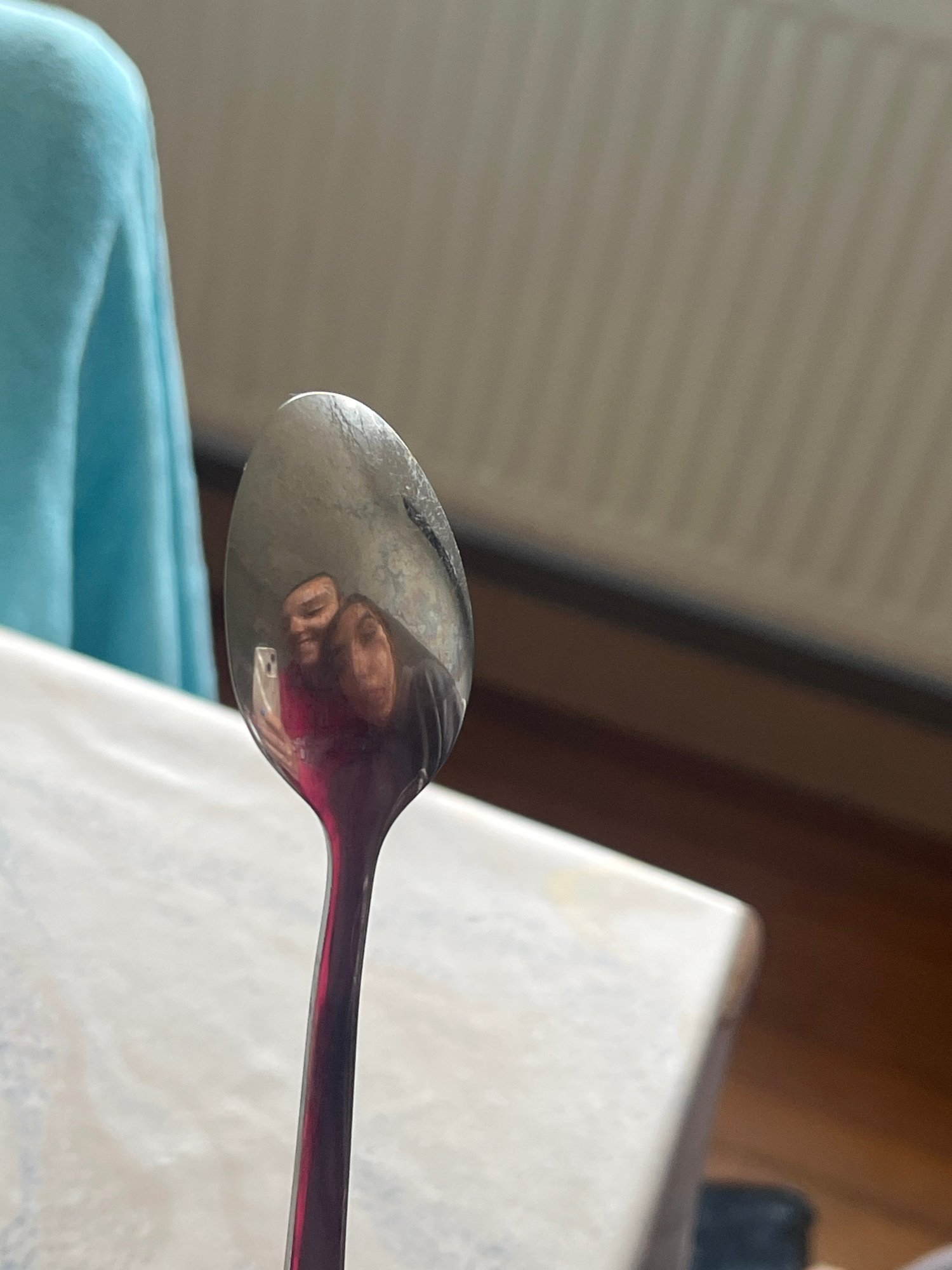The image shows a close-up of a metal spoon, reflecting a distorted image of a person holding a smartphone. The spoon is positioned against a background that includes a light blue, textured surface, l…read more