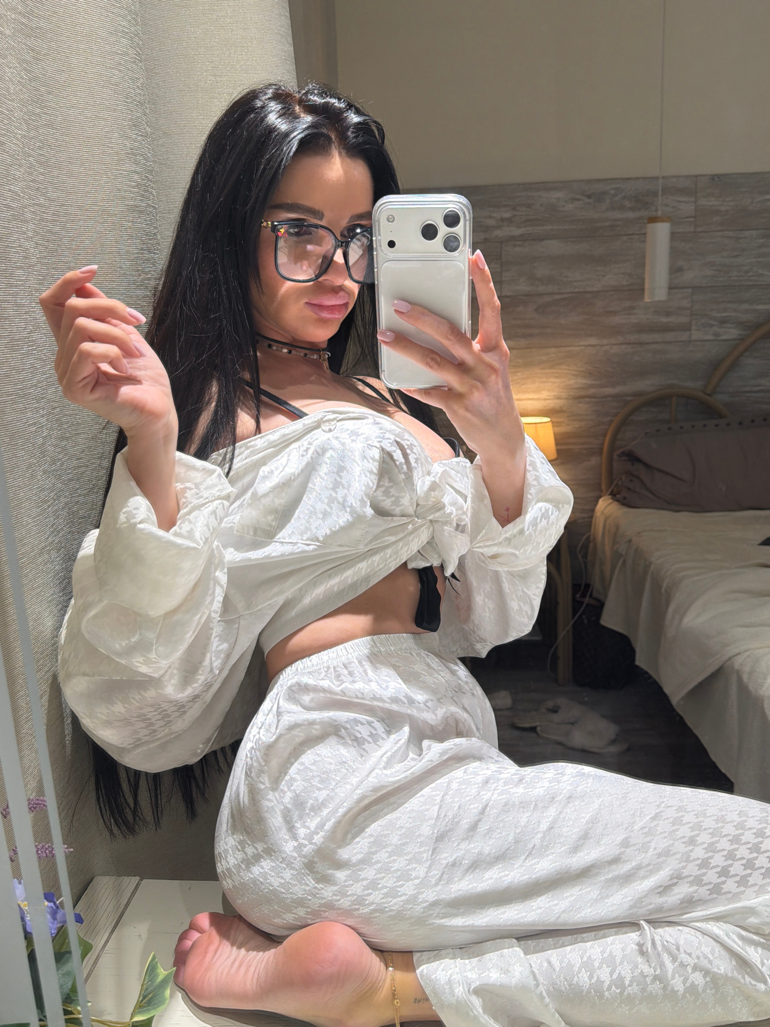 A woman is taking a selfie in what appears to be a bedroom setting. She is wearing glasses, a white long-sleeved top tied at the waist, and white pants with a subtle pattern. The woman is holding a sm…read more