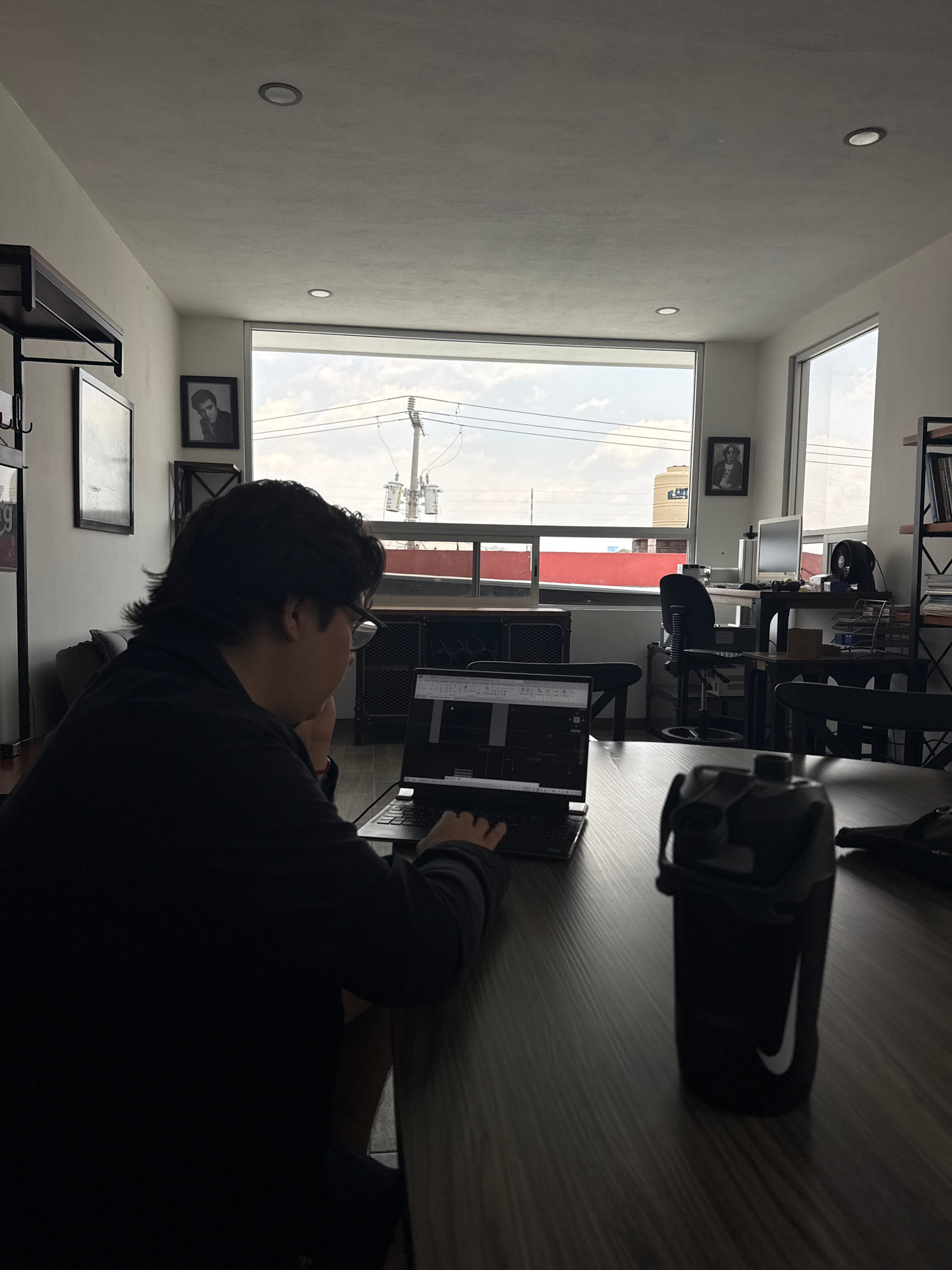 A person is seated at a desk, typing on a laptop. A black Nike duffel bag sits on the desk beside the laptop. The room has a large window with a view of San Bernardino Tlaxcalancingo, Mexico, indicate…read more