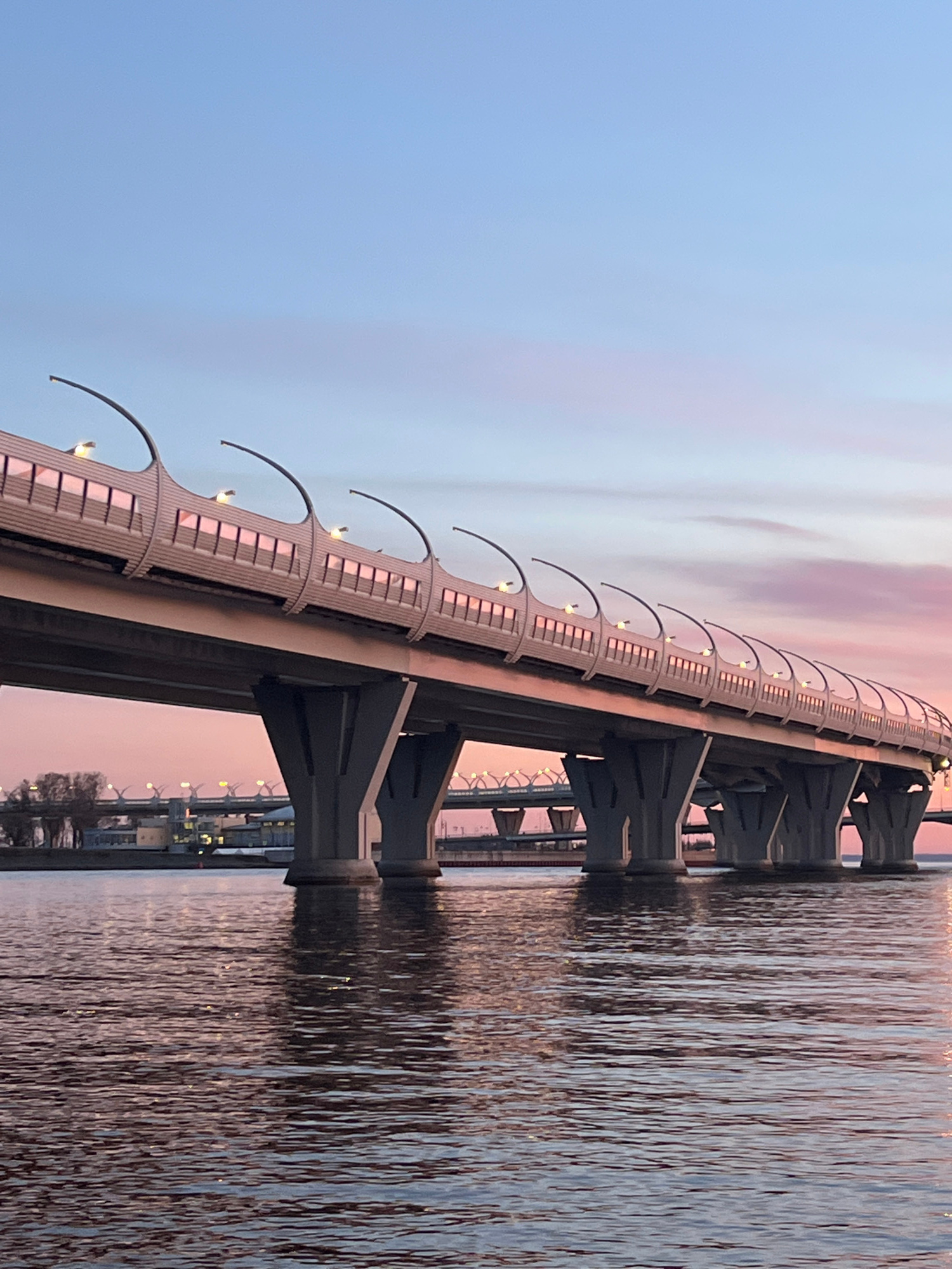 The image captures a modern bridge spanning a body of water at twilight, likely in Saint Petersburg, Russia. The bridge, extending diagonally across the frame from the left foreground to the right bac…read more