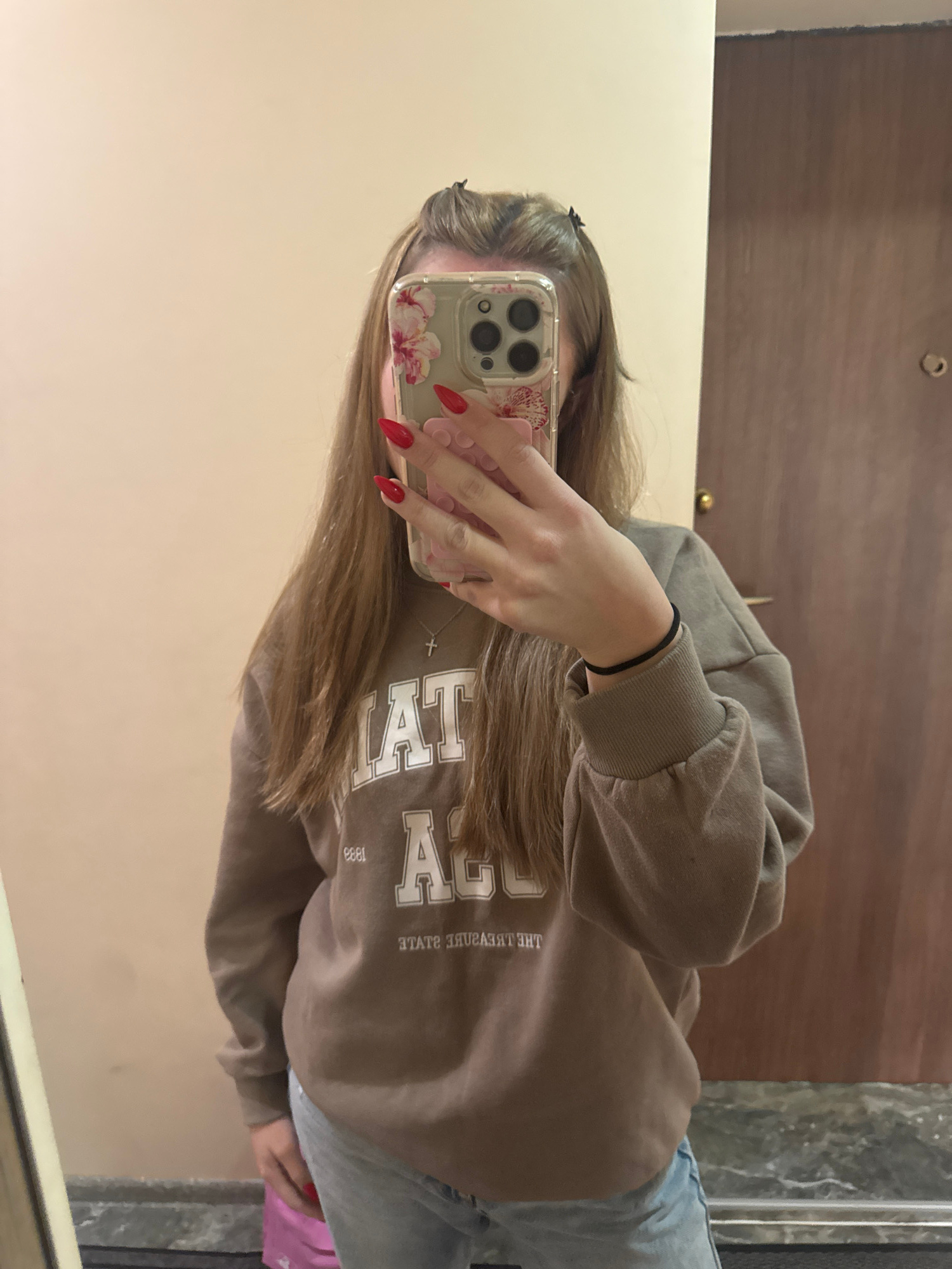 A woman stands indoors, holding a smartphone with a floral-patterned case, seemingly taking a selfie in front of a mirror. She is wearing a brown sweatshirt with white lettering that reads "STATE", wi…read more