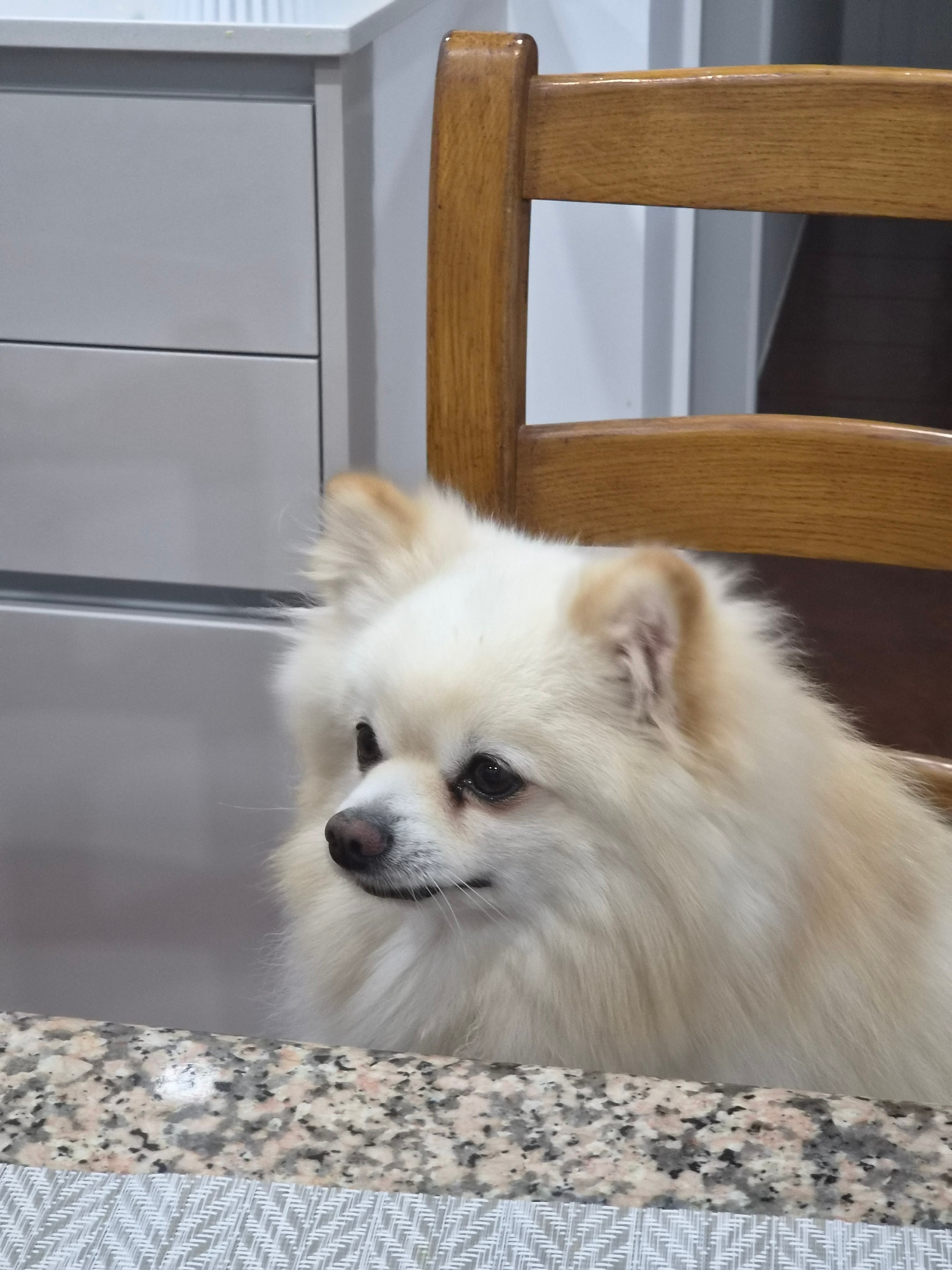 A medium shot depicts a white Pomeranian dog's head and neck from the chest up. The dog is positioned next to a light brown wooden chair with vertical slats. A granite countertop is to the right of th…read more