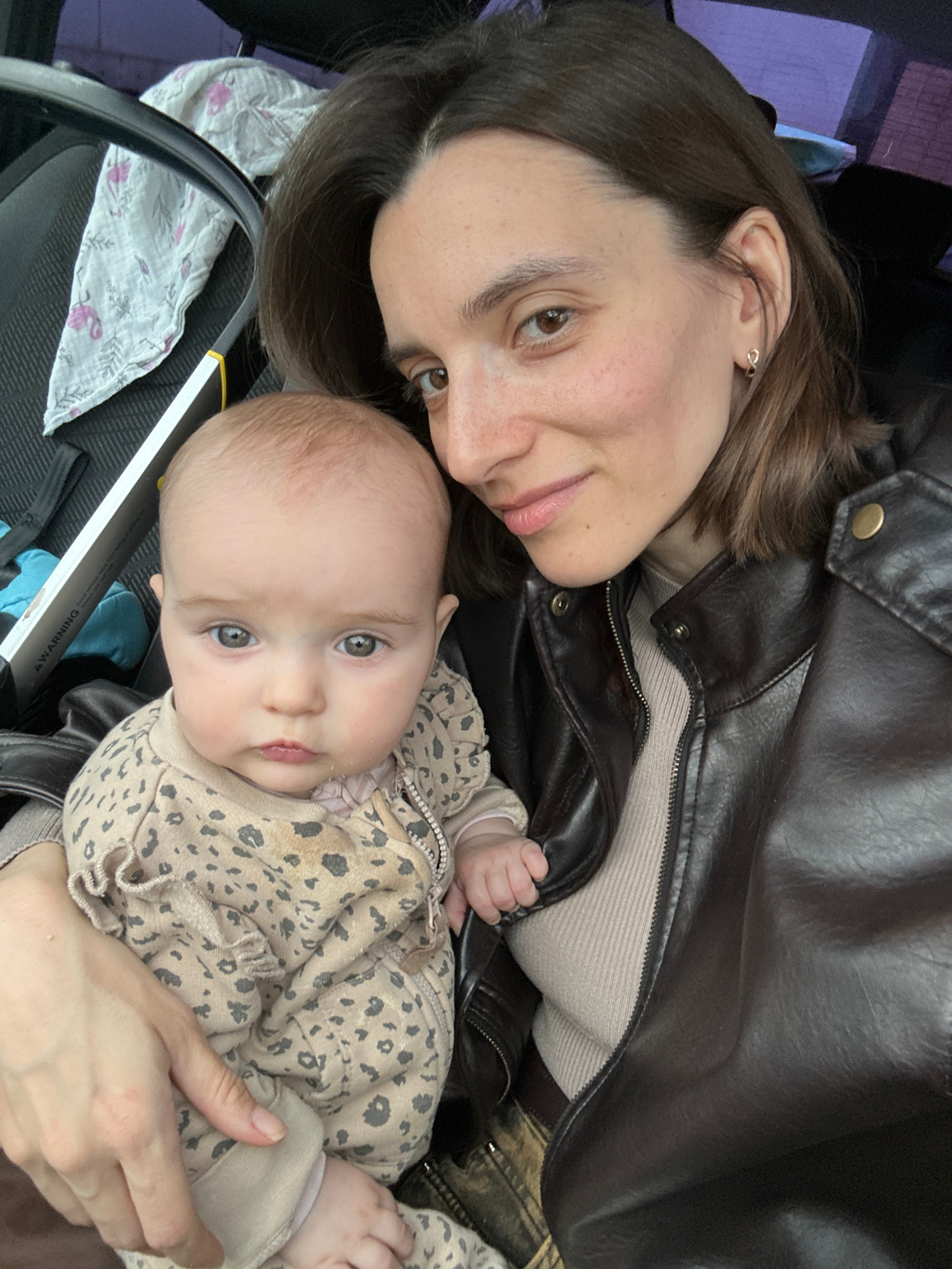 A woman with dark brown hair and eyes, wearing a brown leather jacket, is holding a baby in her arms. The baby, dressed in a light-colored outfit with a small animal print, is looking towards the came…read more