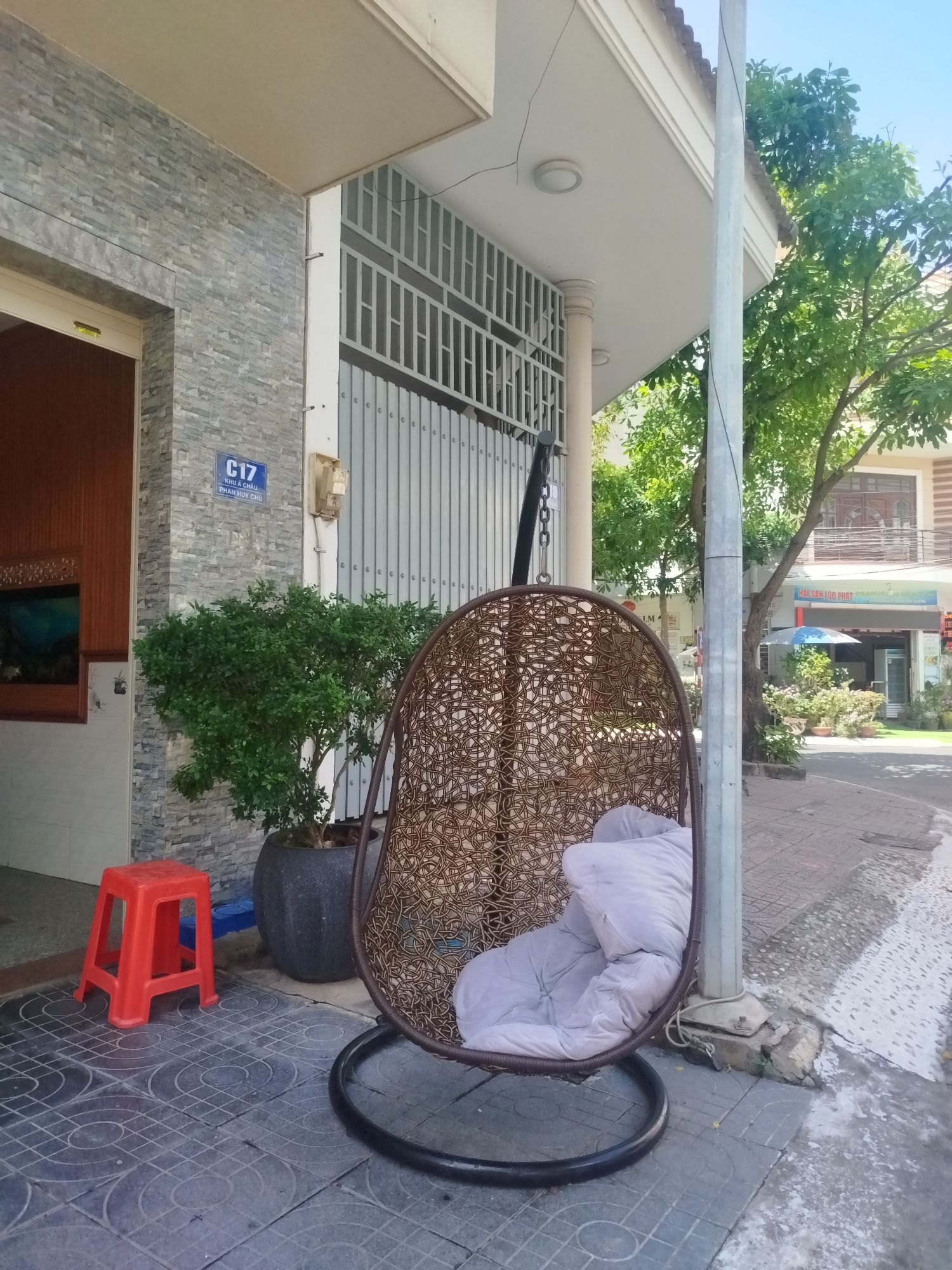 The image depicts a residential street scene in Ho Chi Minh City, Vietnam. The foreground features a hanging chair made of woven material with a light gray cushion, positioned on a tiled sidewalk next…read more