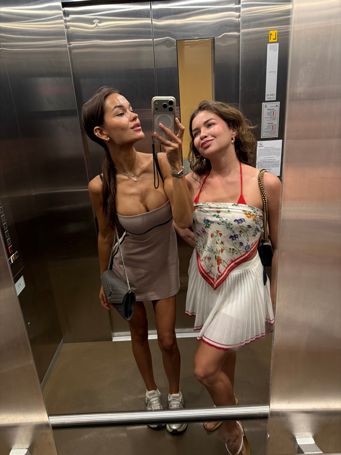 Two adult females are positioned inside a stainless steel elevator with a brown floor in Choeng Thale, Thailand, taking a mirror selfie. The female on the left, with brown hair in a ponytail, wears a…read more