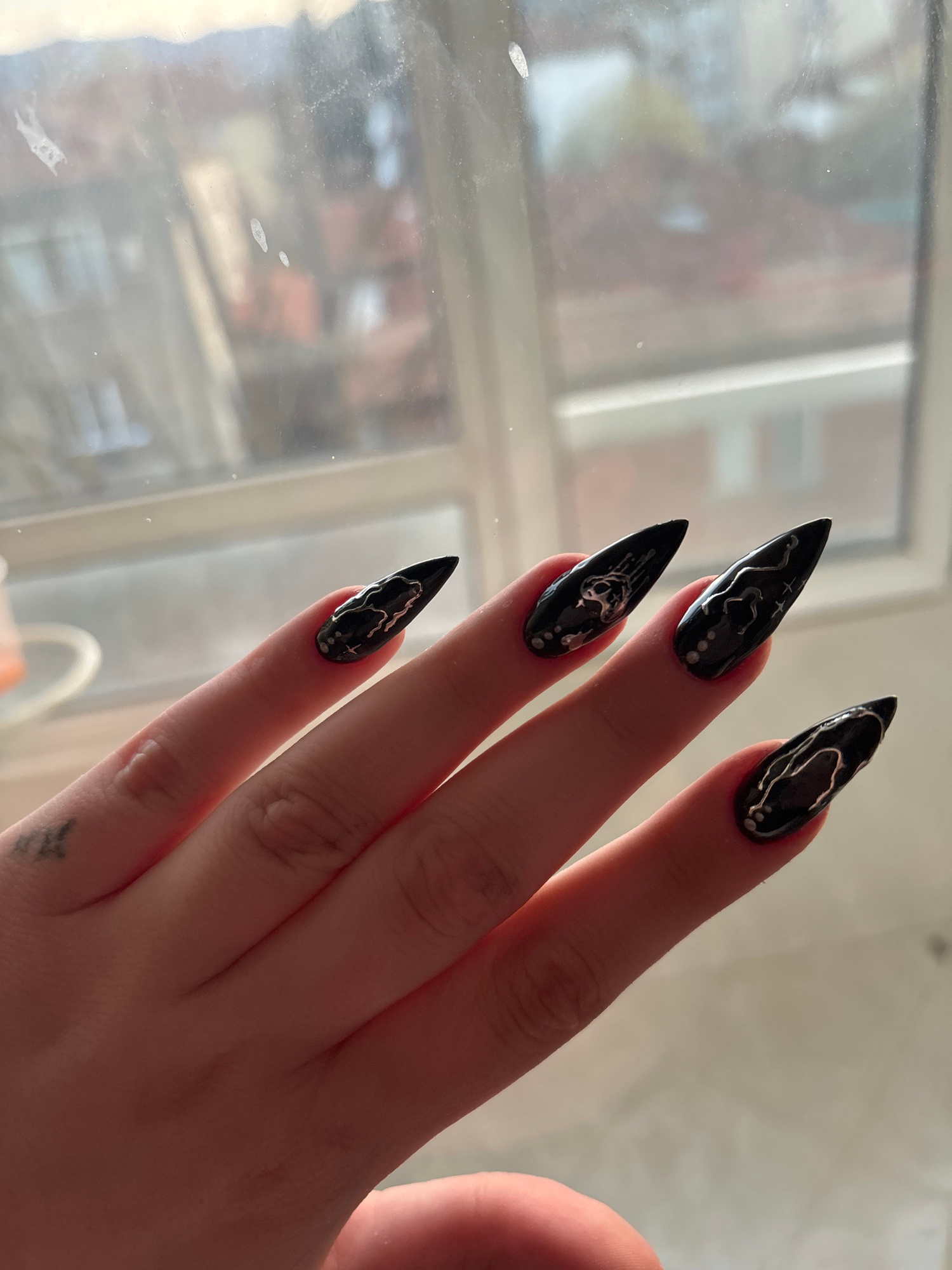 A close-up shot focuses on a person's hand, showcasing four elongated, stiletto-shaped nails painted with a glossy black base and intricate silver designs resembling veining or abstract patterns. Each…read more
