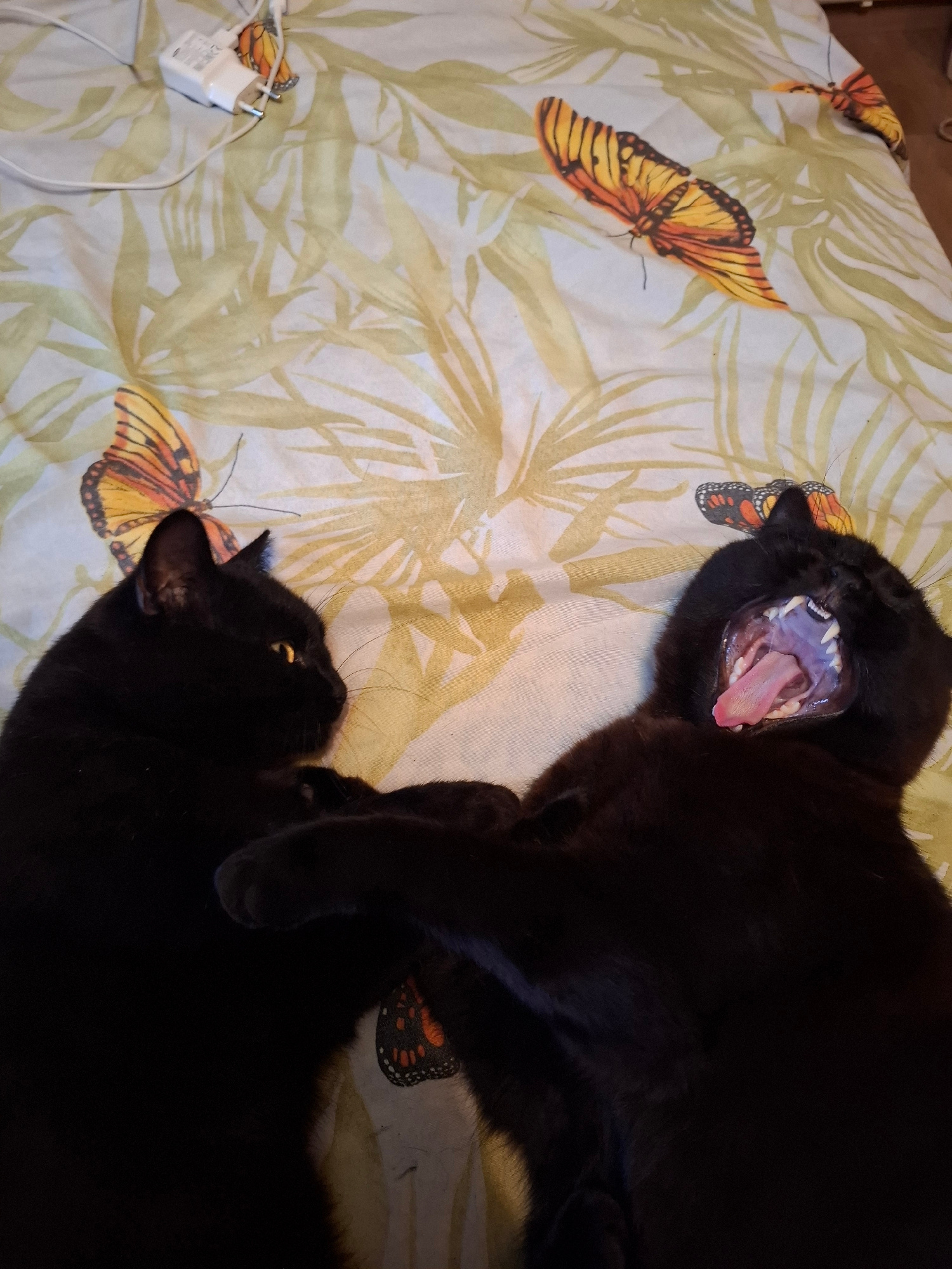 The image depicts two black cats lying on a bedspread with a pattern of green leaves and orange butterflies. One cat is yawning, revealing its teeth and pink tongue. The location is not identifiable f…read more