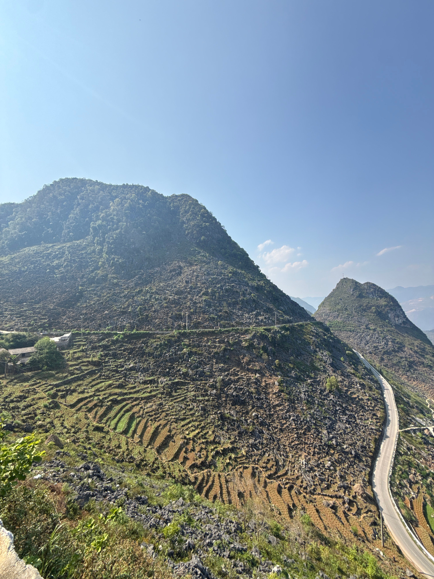 The image shows a mountainous landscape in the Đồng Văn Commune, Vietnam. The foreground features steep, rocky slopes covered in terraced rice paddies and sparse vegetation. A winding road with guardr…read more