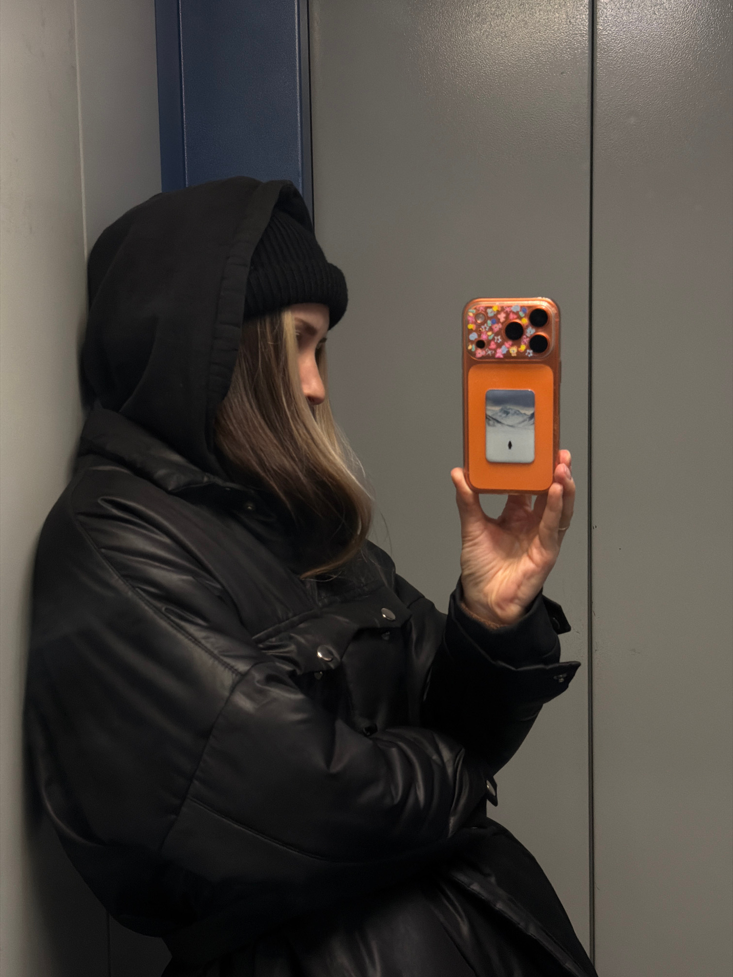 A person is lying on their side, likely on a bench, indoors, with their head towards the left side of the frame. They are wearing a black hooded sweatshirt and a black puffer jacket. The person is hol…read more