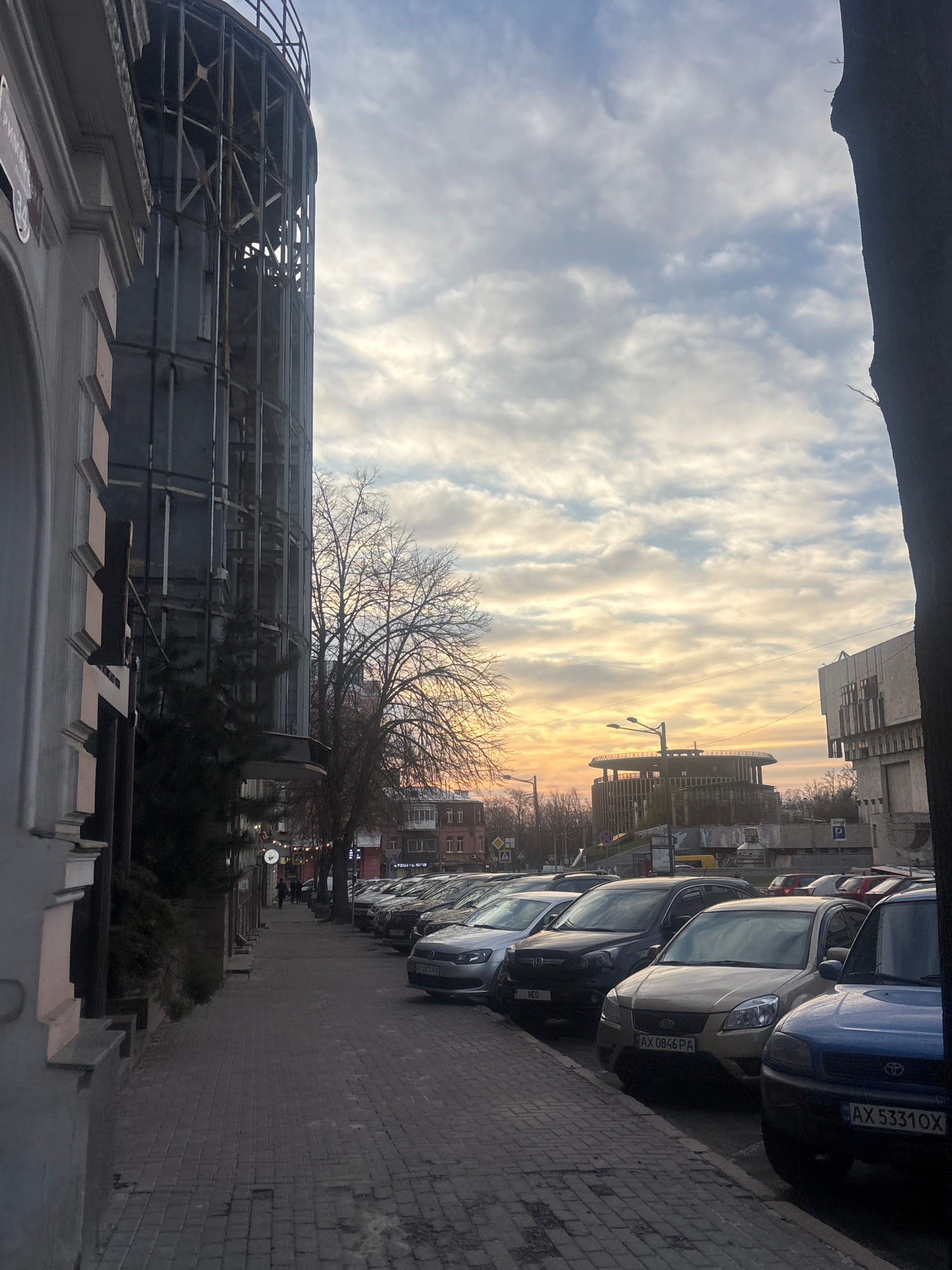 The image shows a street scene in Kharkiv, Ukraine, captured from a low vantage point. The composition is dominated by a partially constructed or renovated building on the left, featuring a metal fram…read more
