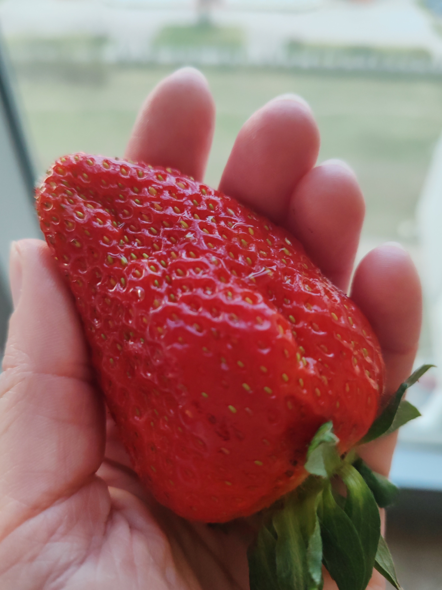 A close-up image captures a person's hand holding a single, unusually large and elongated strawberry. The strawberry, occupying the central and right foreground, is a vibrant, glossy red, suggesting i…read more