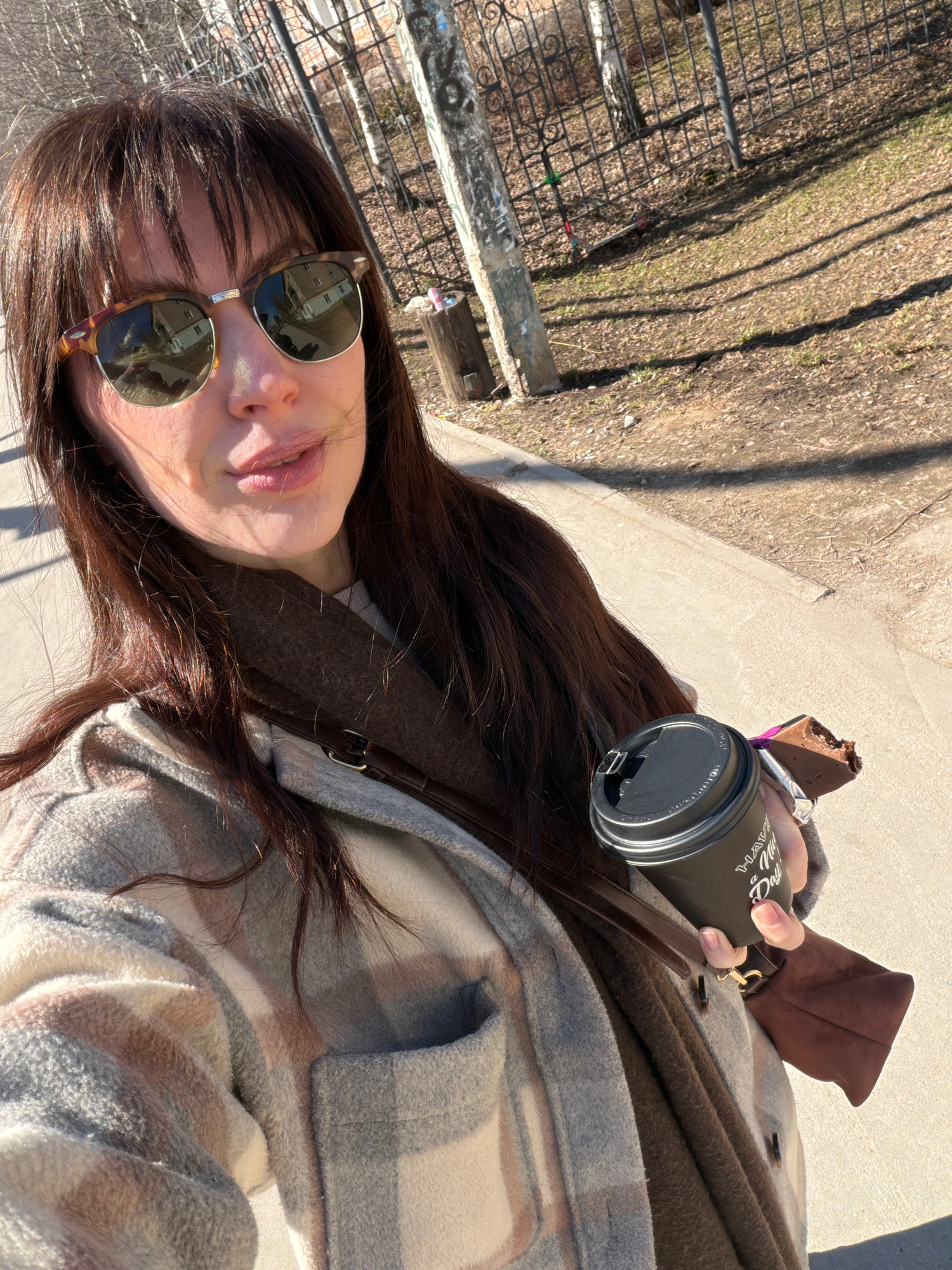 A selfie captures a woman with long brown hair, wearing sunglasses and a brown, plaid jacket, holding a coffee cup and a piece of chocolate. The background shows a fence and foliage. This is likely a…read more