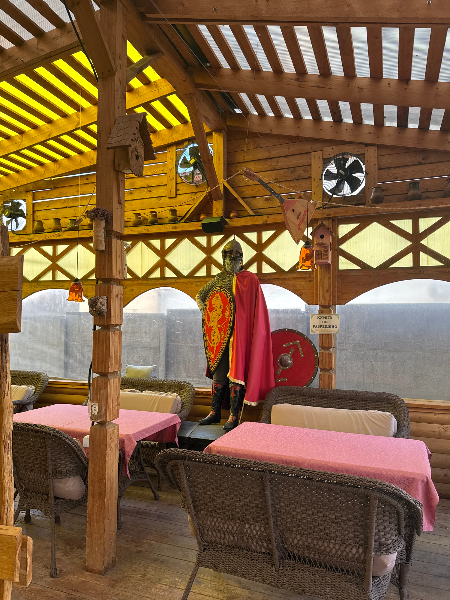 A restaurant in Kladovitsy, Russia, features a faux medieval theme. A suit of armor stands by the window, complete with a red cape, shield, and helmet. Wicker chairs surround tables with pink tableclo…read more