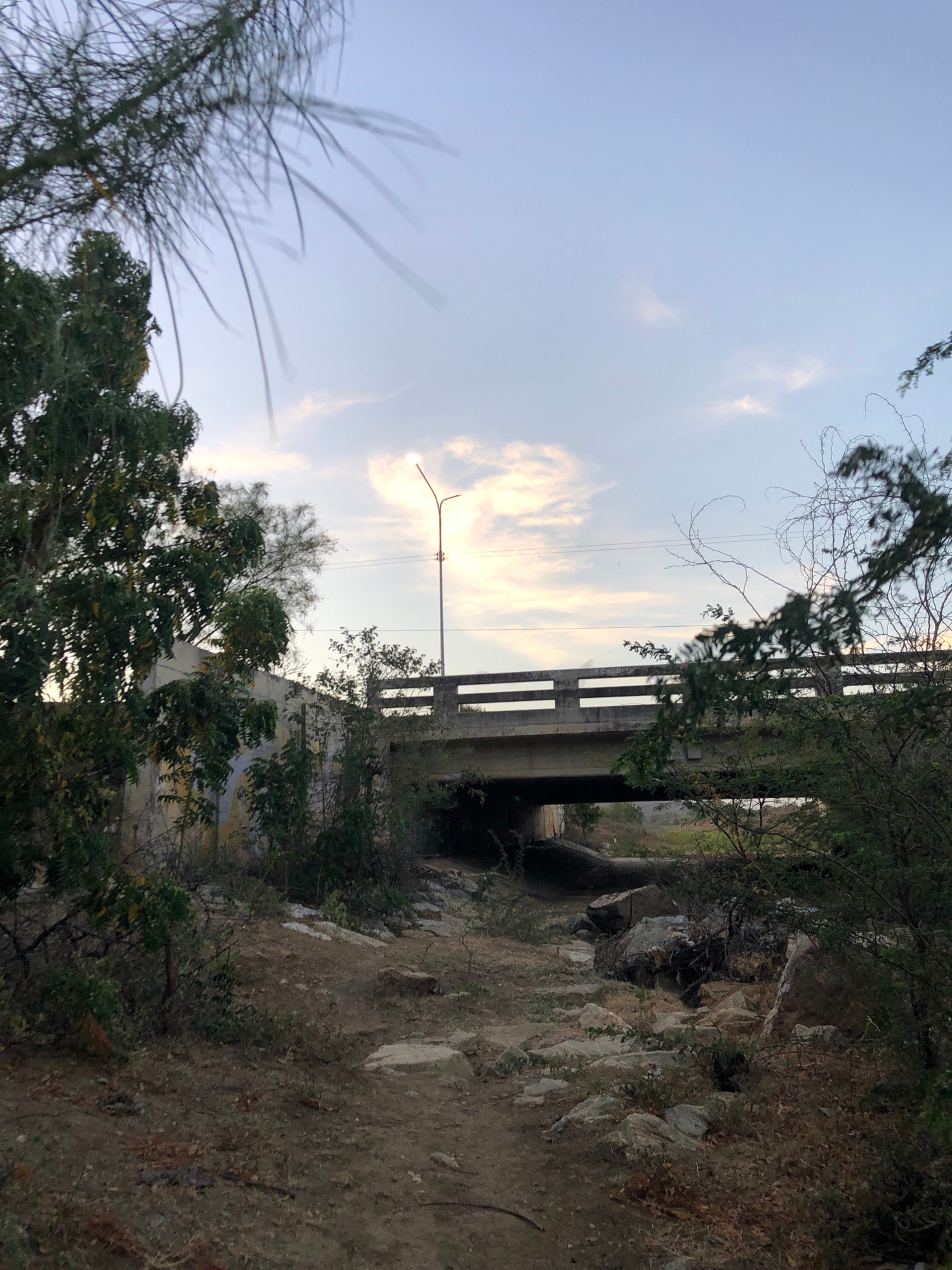 The image shows a bridge in a natural setting. The bridge is made of concrete and has a simple design. The surrounding area is overgrown with vegetation, including trees, bushes, and grass. A dirt pat…read more
