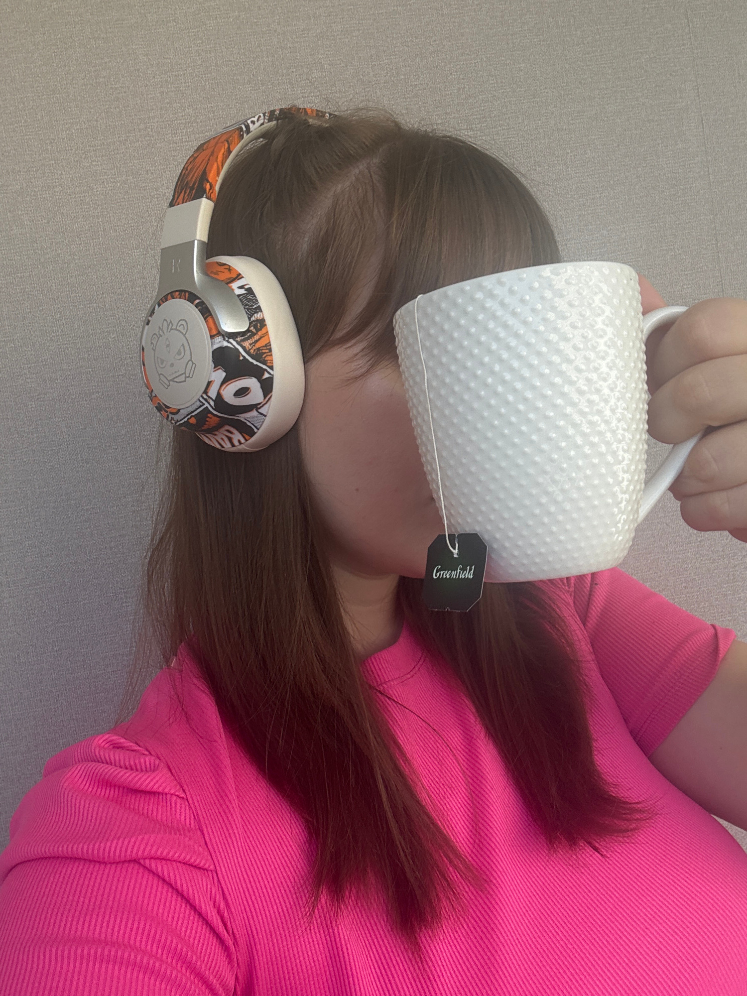 An overhead shot captures a person lying down indoors in Chaikovsky, Russia, engaged in a playful activity. The subject's head, partially obscured, is adorned with patterned over-ear headphones, featu…read more