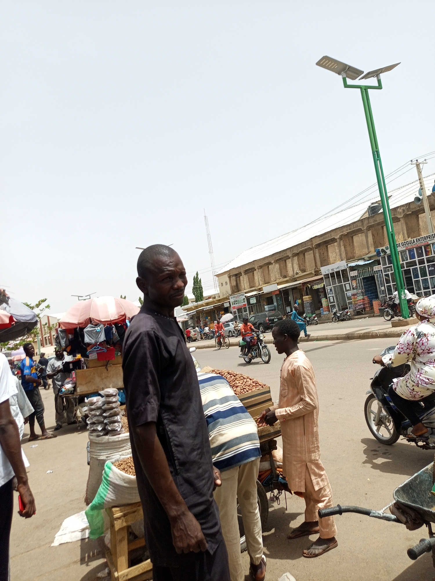 The image depicts a street scene in Arawa, Nigeria. In the foreground, a man in a dark-colored traditional garment is facing the viewer, with a neutral expression. Beside him, another man in a light tan outfit stands near a cart laden with what appears to be peanuts or other nuts. The cart is partially covered with a blue and white striped cloth. Further in the background, there are other people milling about, some under umbrellas. Motorbikes are visible on the road, and a woman wearing a patterned fabric is seated on one. A green solar-powered streetlight stands prominently on the right side of the image. Buildings line the street, with shops and businesses visible. Signage for “DE GOGULA ENTERPRISE” can be seen on one building. The overall environment suggests a busy market or commercial area in the city. | Open Wire