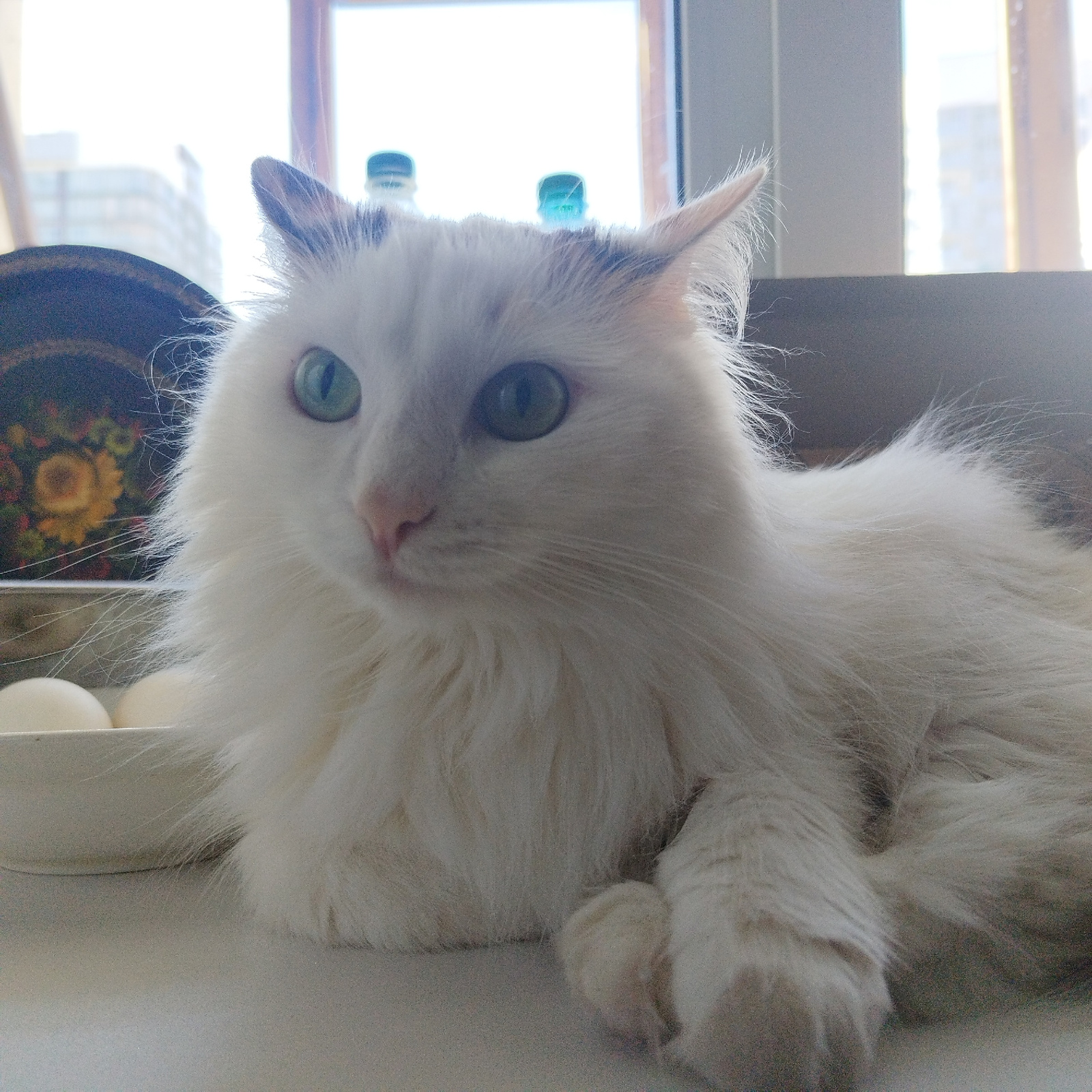 A long-haired white cat with green eyes rests indoors on a white surface. A bowl with white objects is partially visible to the left of the cat. Behind the cat are two bottles. A window is in the back…read more