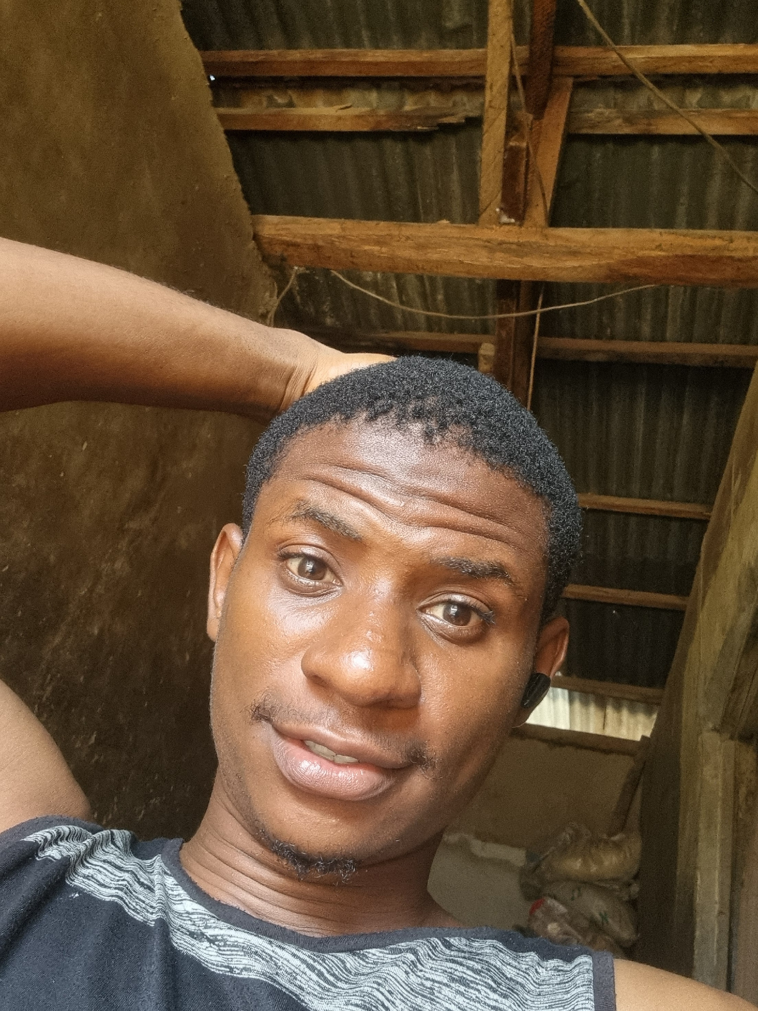 This media file is a selfie portrait of a young Black man, captured with the image rotated 90 degrees clockwise. The man, appearing to be in his 20s or early 30s, looks directly at the camera with a c…read more