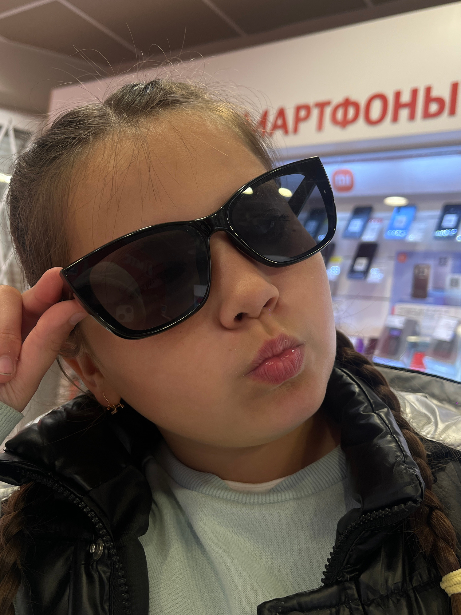 A close-up, slightly off-kilter portrait captures a young person, likely female, posing indoors. She is wearing large, dark sunglasses and has her lips subtly pursed, accented with glossy lip makeup.…read more
