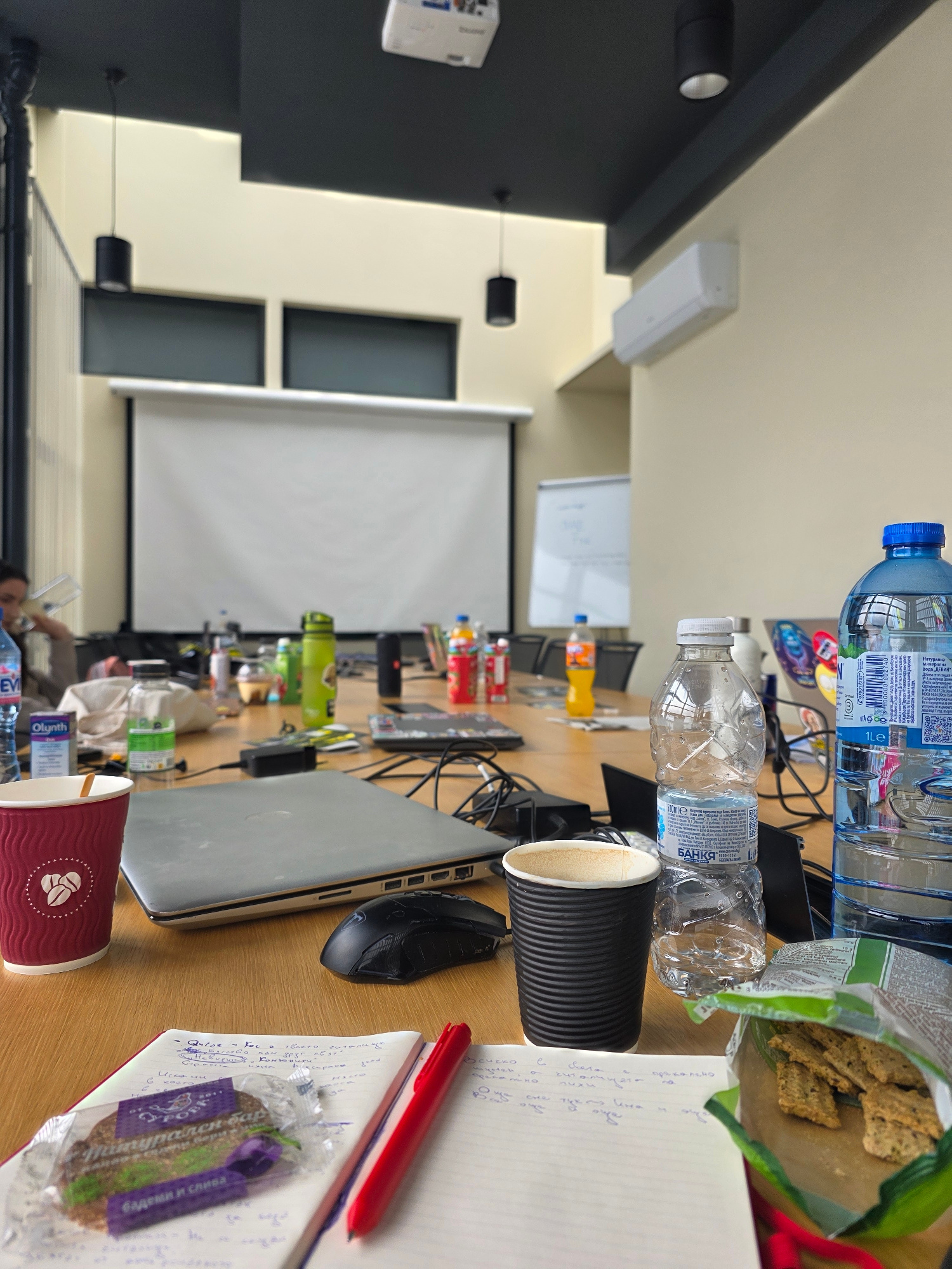 This image shows a conference room with a long table covered in various items. There are multiple water bottles, coffee cups, a laptop, a computer mouse, and snacks like cookies and chips scattered ac…read more
