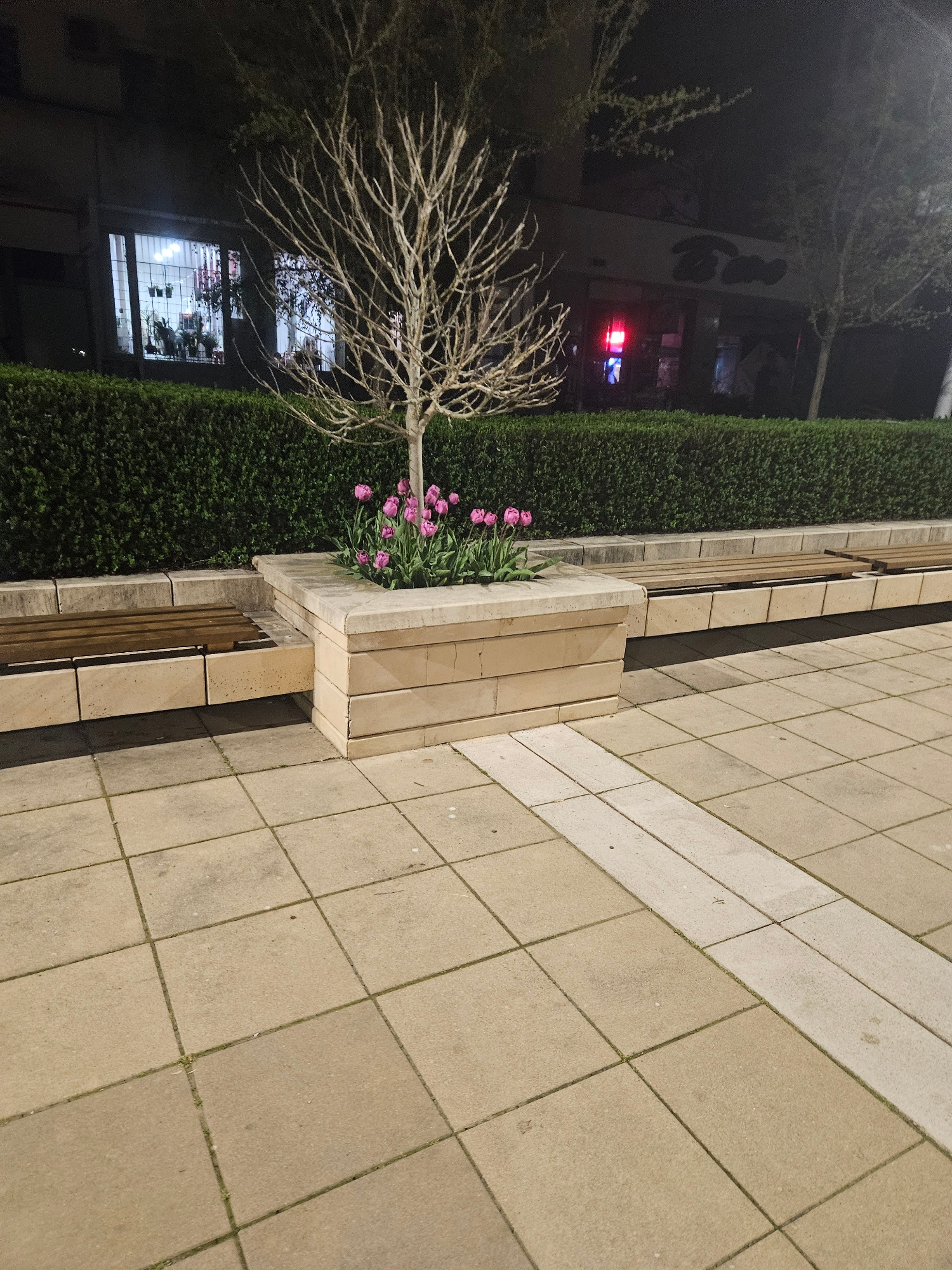 The image presents an outdoor scene at night, likely in Yambol, Bulgaria, featuring a sidewalk paved with light-colored, rectangular concrete tiles. Adjacent to the sidewalk is a raised flower bed con…read more