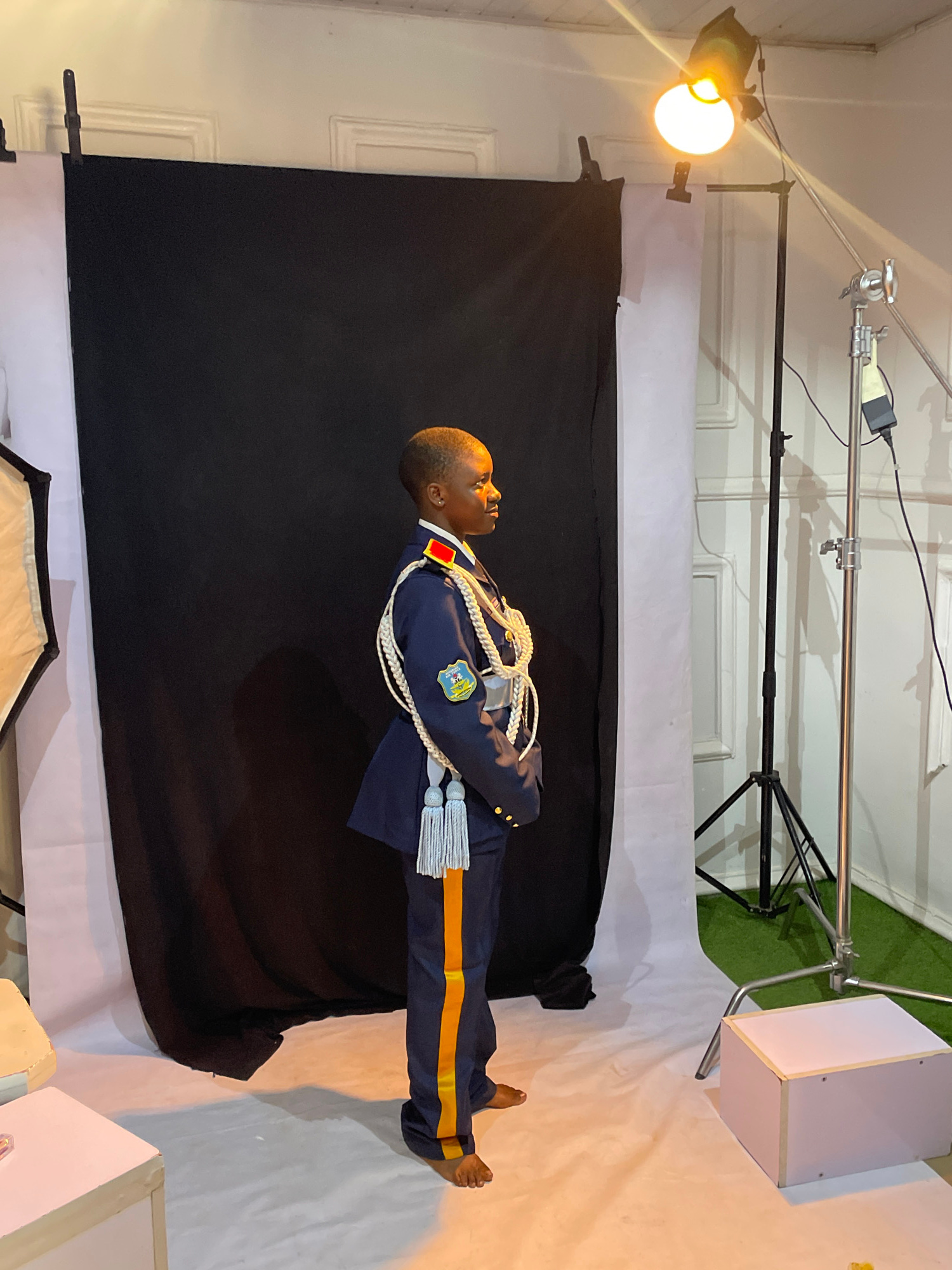 A studio portrait of a young man in a military-style uniform with blue and gold trim. The uniform has a white rope detail and a badge. He is lying on his side against a black backdrop, which is part o…read more
