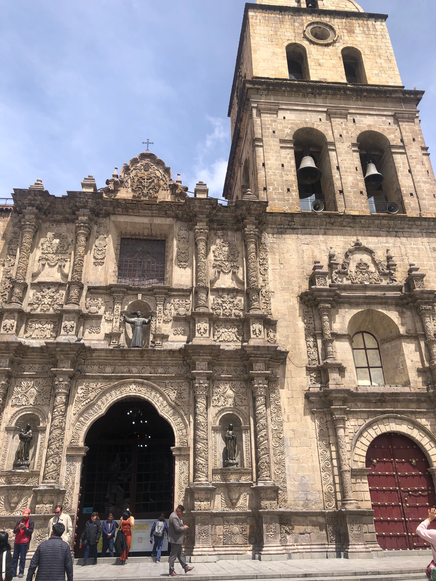 The image depicts the elaborate stone facade of the Basilica of San Francisco in La Paz, Bolivia, viewed from a low angle on a clear day with scattered clouds. The Baroque-style structure is construct…read more