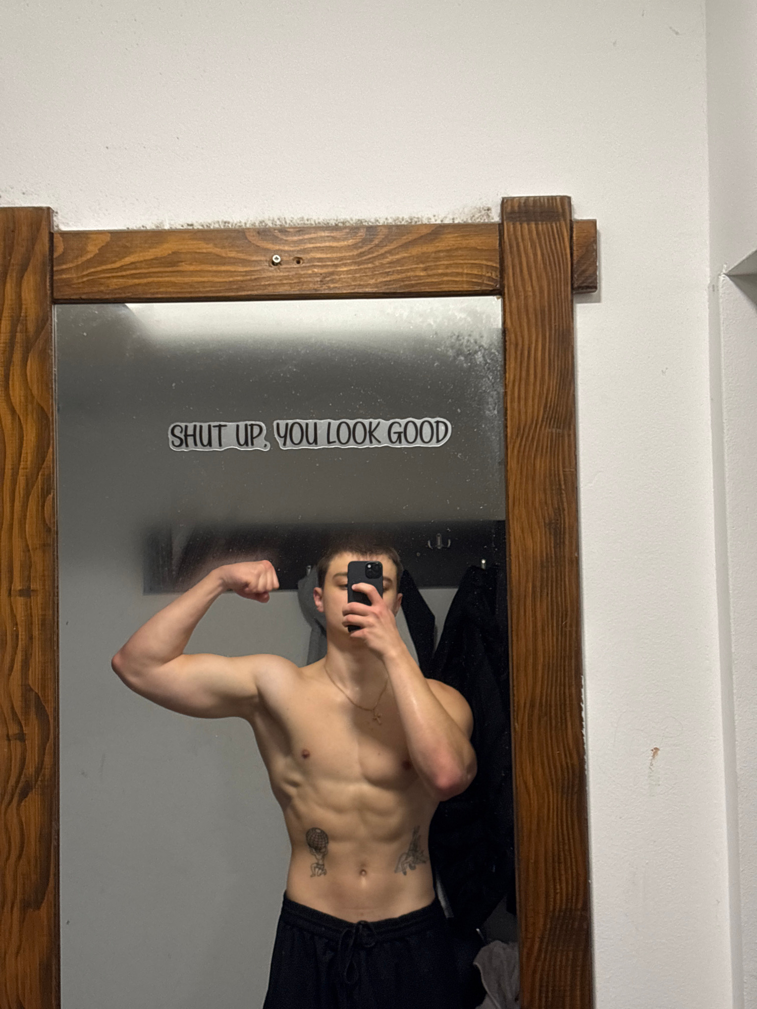 An indoor mirror selfie depicts a light-skinned male, shirtless and wearing black drawstring pants. He poses with his right arm flexed, showcasing his bicep, while holding a dark-colored smartphone wi…read more