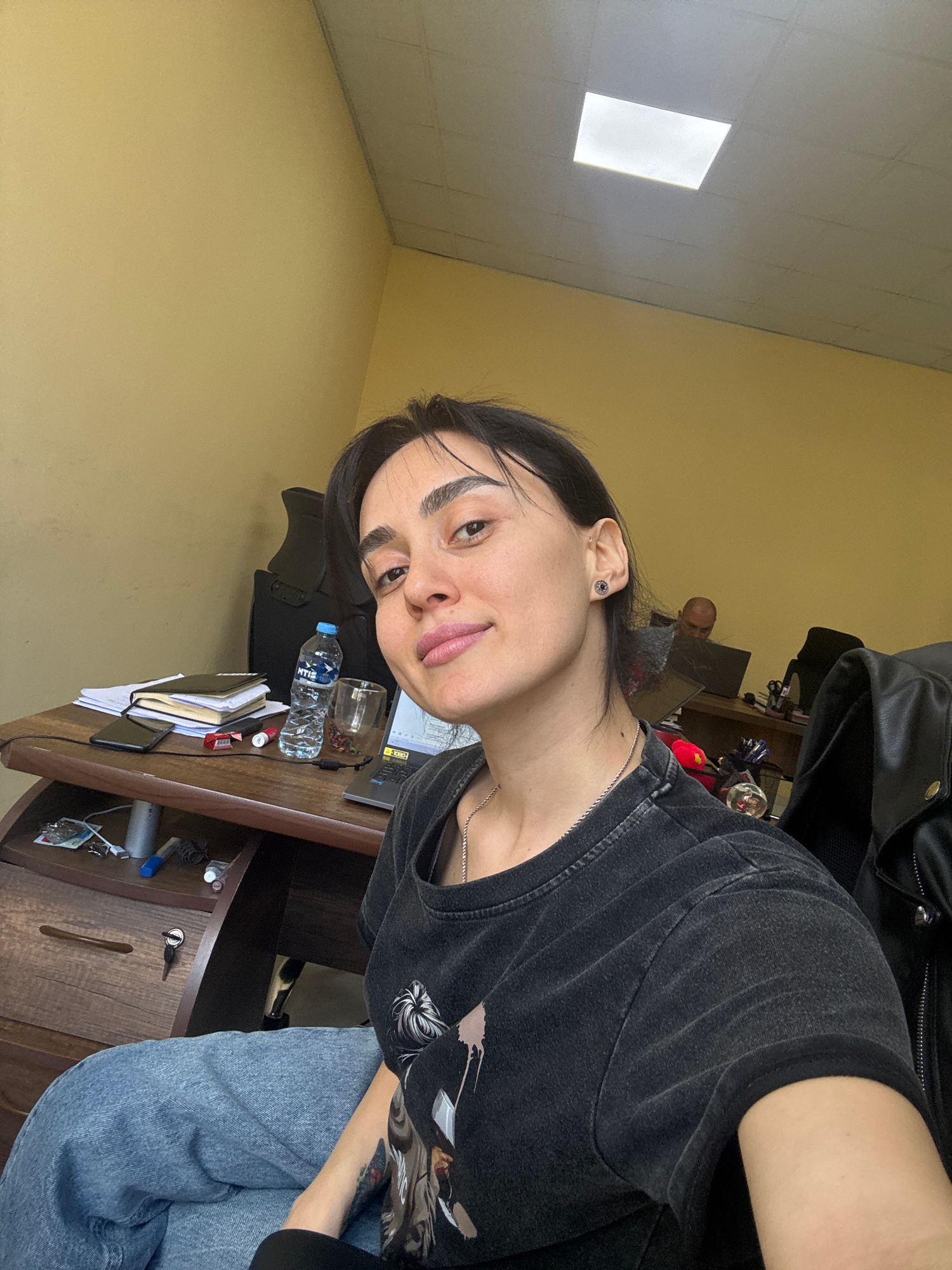A medium indoor shot shows a light-skinned individual with dark hair and eyebrows. The person is wearing a dark graphic t-shirt and light blue jeans. A black leather jacket hangs on a chair behind. Th…read more