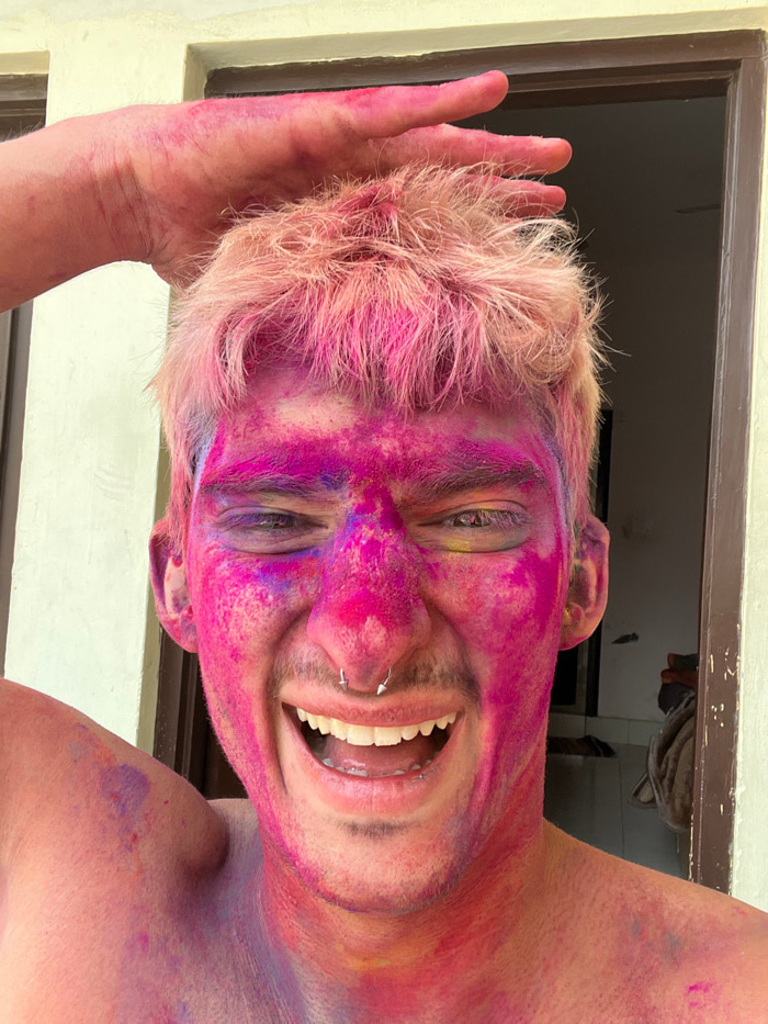A close-up portrait captures a single individual, appearing male, prominently displaying extensive coverage of pink, purple, and yellow Holi powder. The subject's light-colored hair is heavily dusted…read more