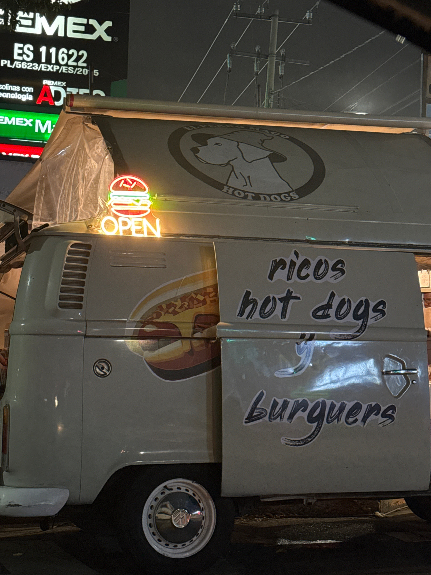 The image shows a food truck in what appears to be Puebla, Mexico. The truck is predominantly off-white and features several food-related graphics. There is a circular logo with a dog and the words "H…read more