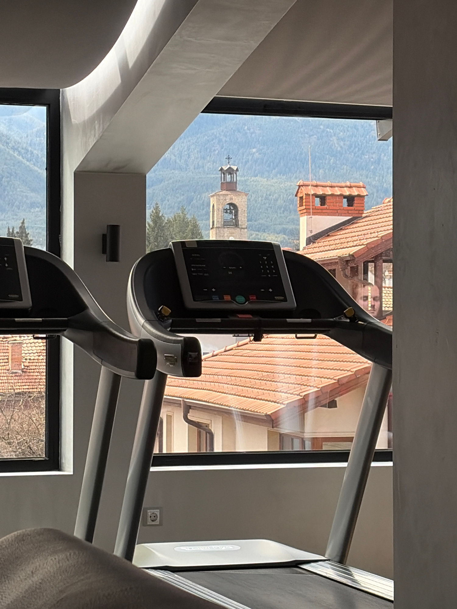 A low-angle, indoor shot shows a treadmill in front of a window with a view of a building exterior, possibly in Bansko, Bulgaria. The treadmill's console with a screen is prominently featured. The ext…read more