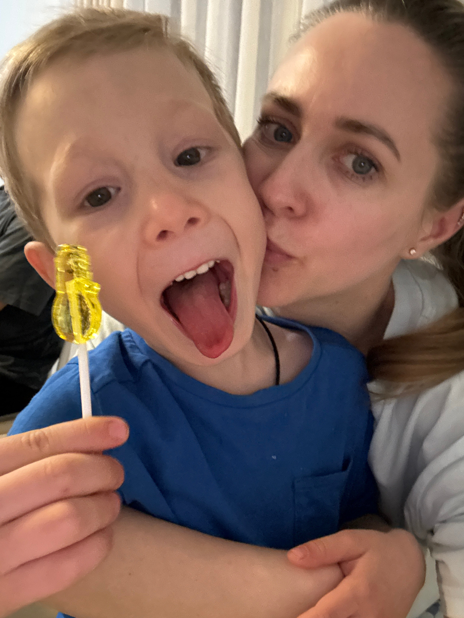 A fair-skinned adult female with light brown hair is positioned behind and partially to the side of a fair-skinned child with blond hair. The woman is giving the child a kiss on the cheek. The child i…read more