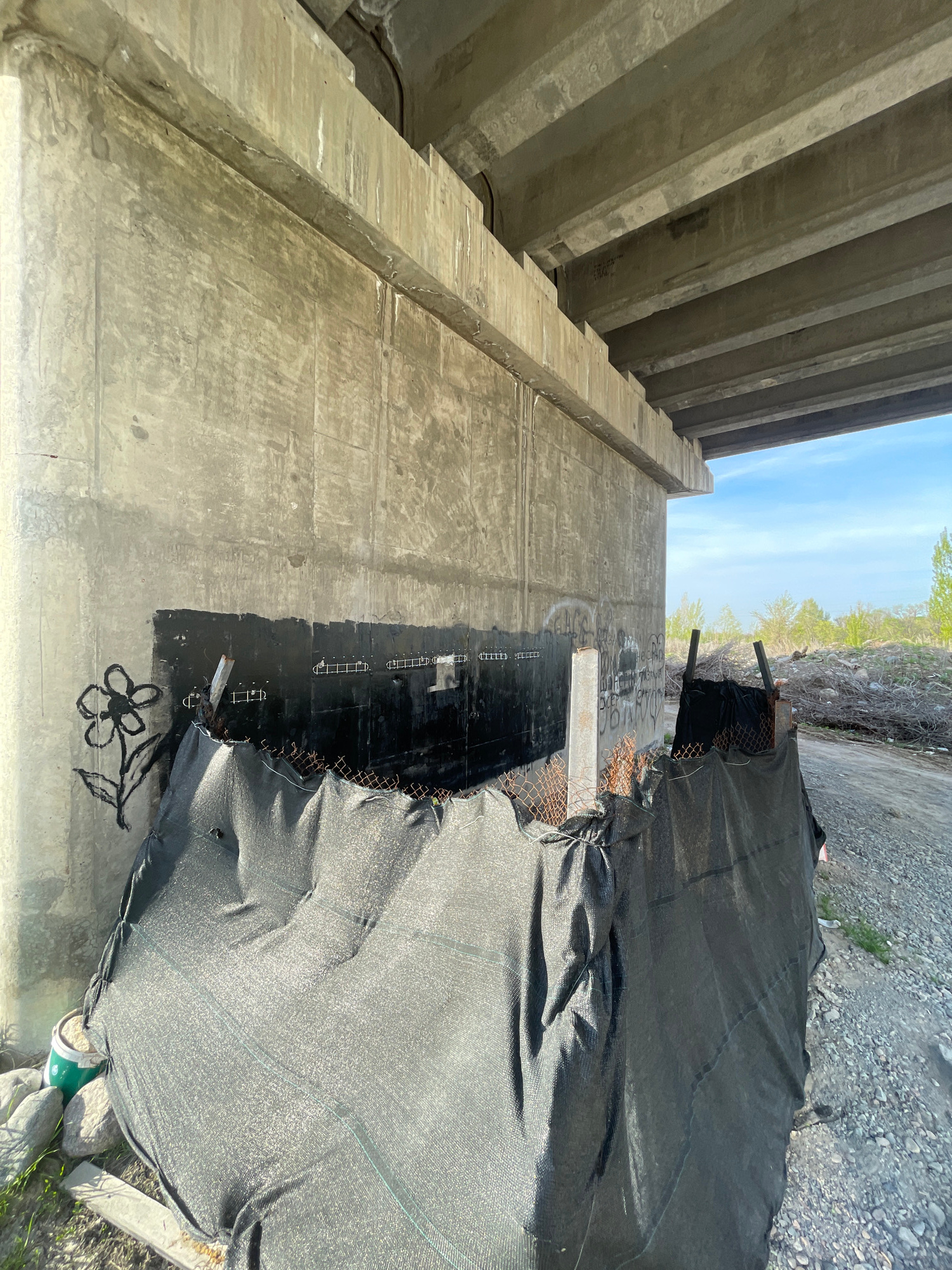 The image shows a section of a concrete overpass in what appears to be an abandoned or neglected area. The structure has exposed concrete beams above. A portion of the overpass wall is visible, with s…read more