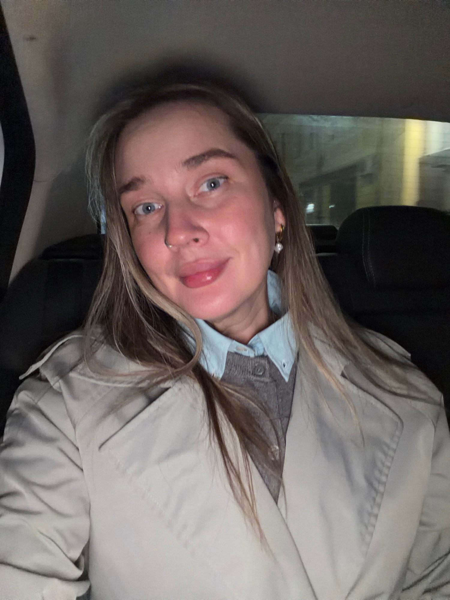 A young woman with light skin, blue eyes, and blonde hair is the main subject of the photograph. She is wearing a light-colored trench coat over a gray vest and a light blue button-down shirt. The wom…read more