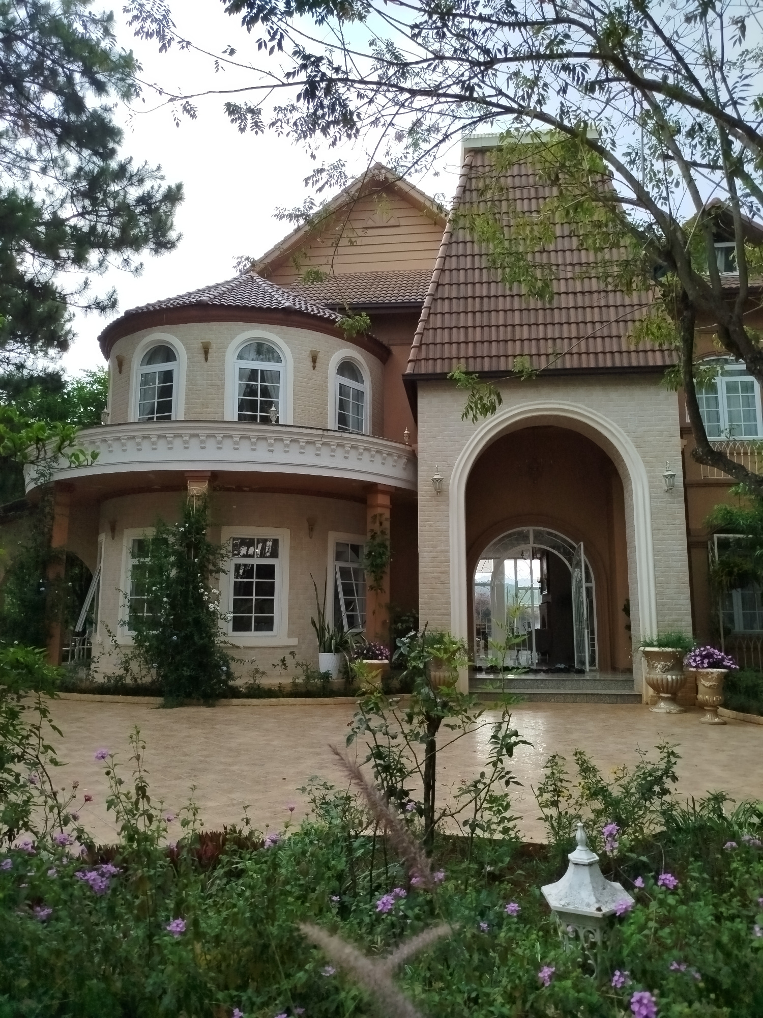 The image depicts a large, ornate residence in Da Lat, Vietnam, characterized by its European-style architecture. The house features a combination of beige brick and wood siding, with a red-tiled roof…read more
