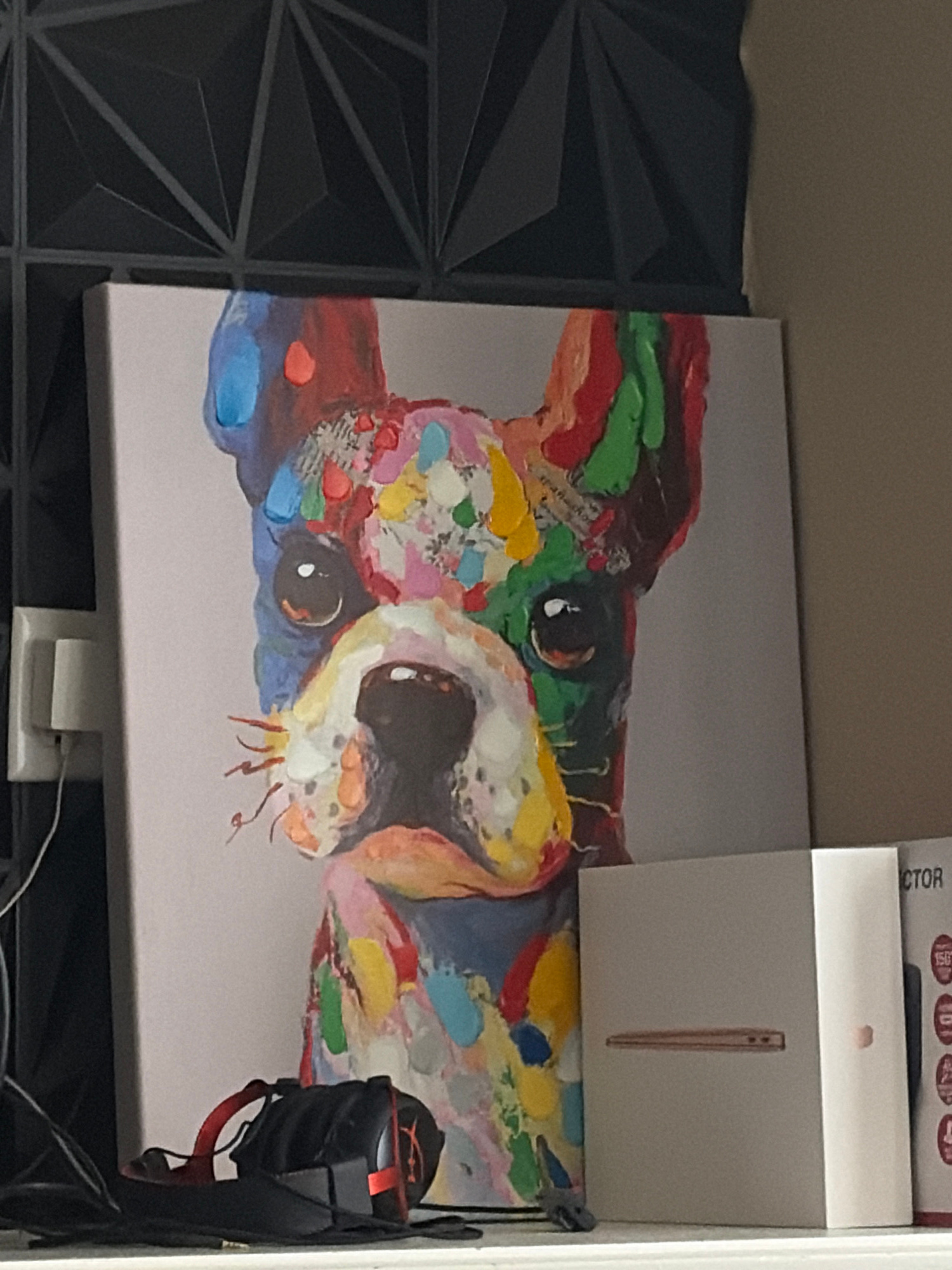 The image shows a room interior. On the left, there's a dark wall panel with a triangular, geometric pattern. To the right is a canvas print of a dog's face depicted in a colorful, abstract style. Par…read more