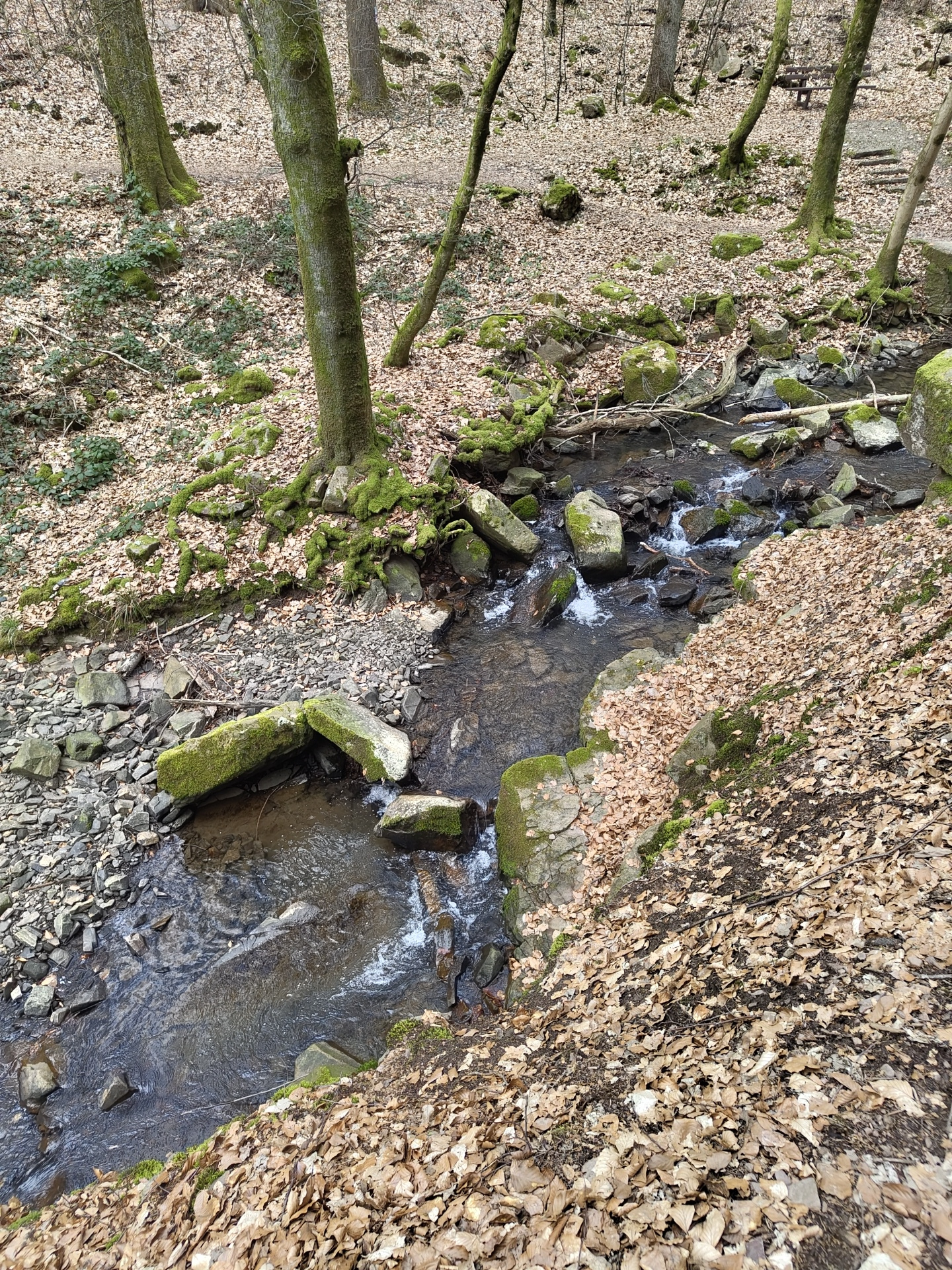 A landscape photo shows a stream flowing through a forest in Mettlach, Germany. The stream is bordered by rocks, moss, and fallen leaves. Trees are visible on both sides of the stream. The light indic…read more
