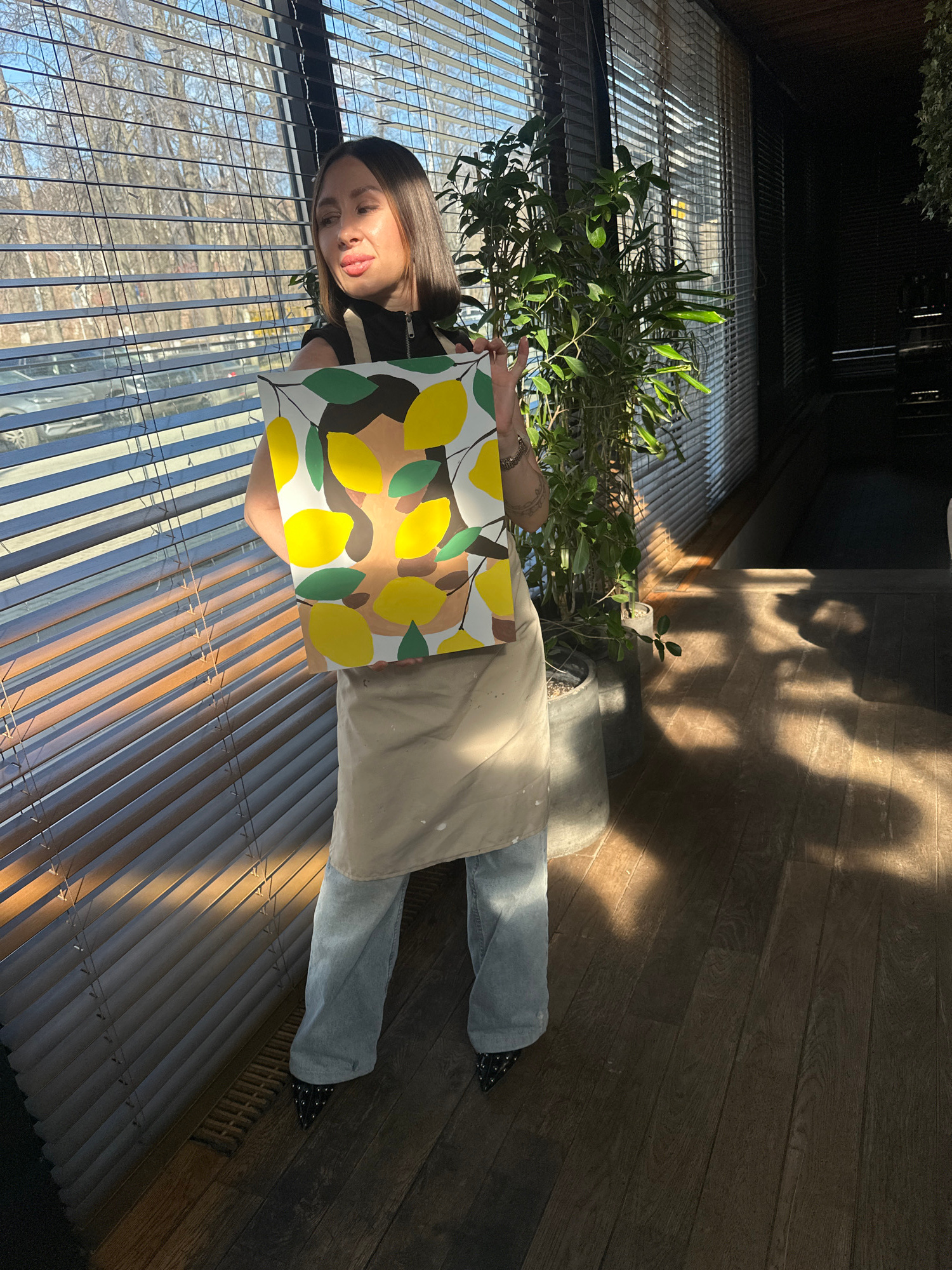 A woman stands inside a room with slatted windows. She holds a lemon-themed painting. She wears blue jeans, black shoes with studs, and a beige apron. The room has wooden floors and a potted plant. Th…read more
