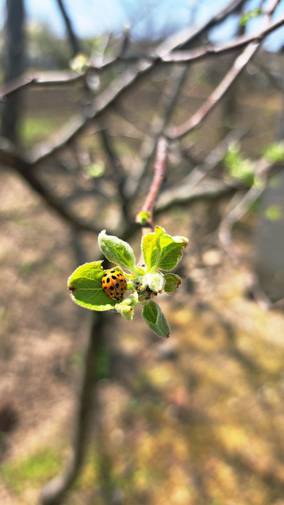 A close-up, horizontally oriented photograph captures a vibrant orange ladybug with numerous black spots resting on a cluster of small, bright green leaves and budding branches. The ladybug is positio…read more