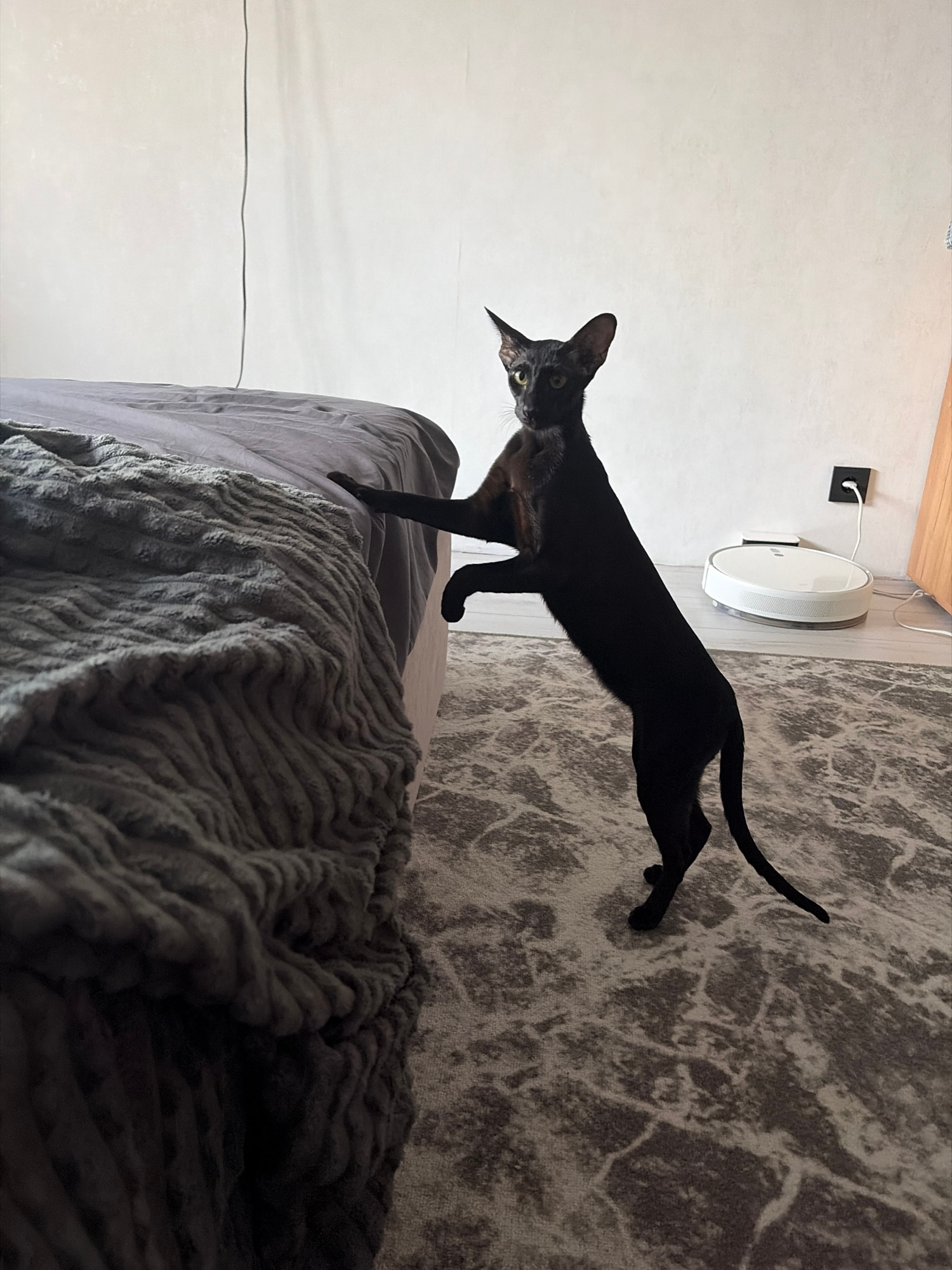 A medium-shot, indoor photograph shows a black cat in mid-air leaping from a gray bed to a gray patterned rug, in Chaikovsky, Russia. The cat is stretched out with its head oriented towards the left o…read more