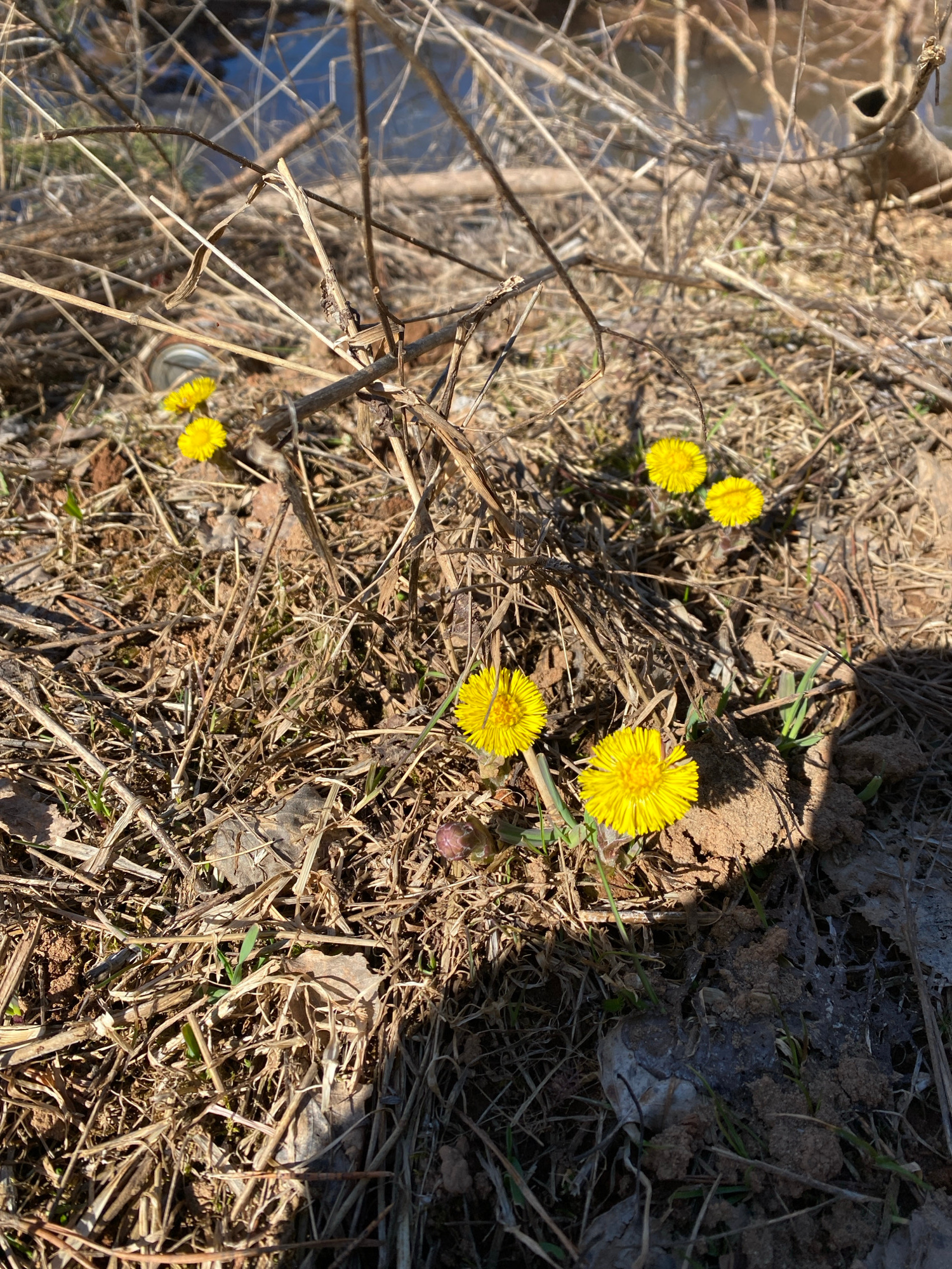 The image depicts a patch of ground covered with dry grass, twigs, and dead leaves. Five bright yellow flowers, likely Coltsfoot (Tussilago farfara), are scattered amongst the debris. In the backgroun…read more