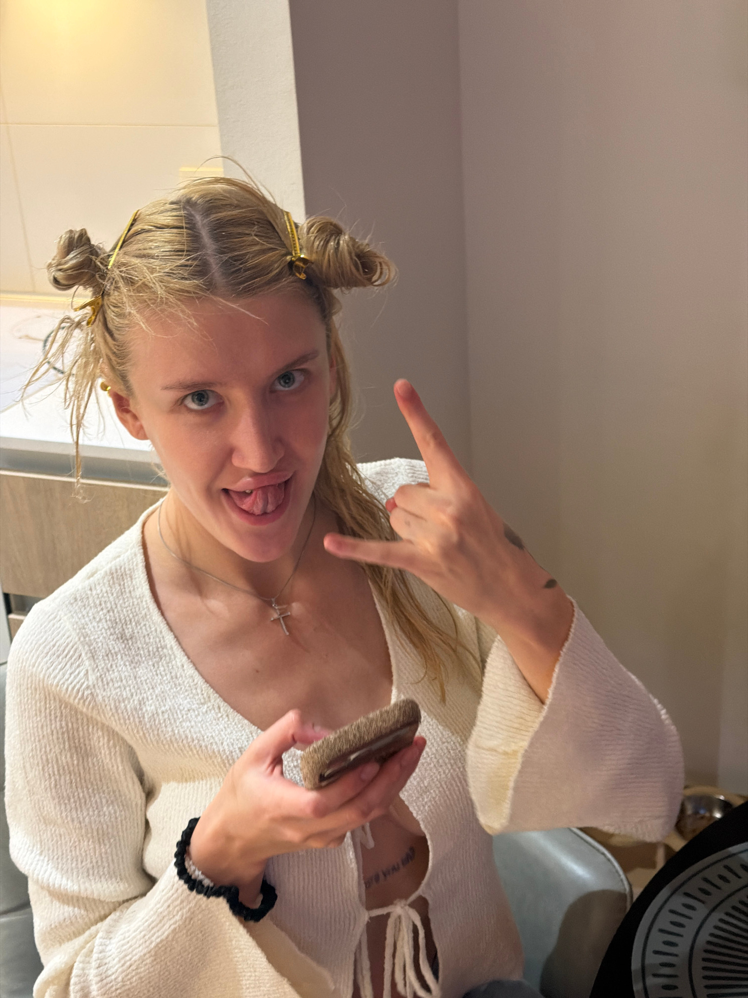 A blonde woman with her hair in two buns, each held in place with gold clips, is sticking her tongue out and giving the "rock on" hand gesture. She is wearing a white knit sweater and a silver cross n…read more