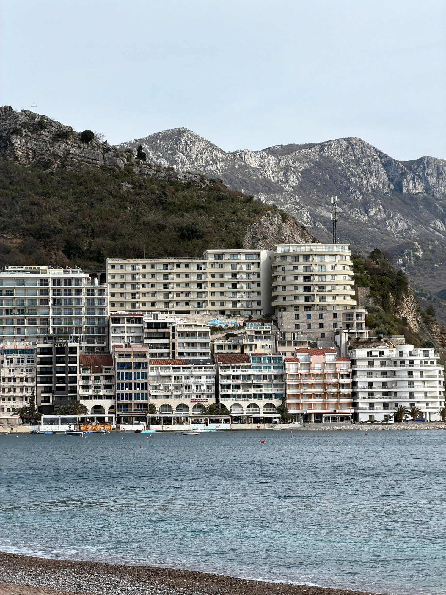 The image shows a coastal view of Rafailovići, Montenegro, with a shoreline lined by multi-story buildings transitioning towards the sea. The architecture is modern, with numerous windows and balconie…read more