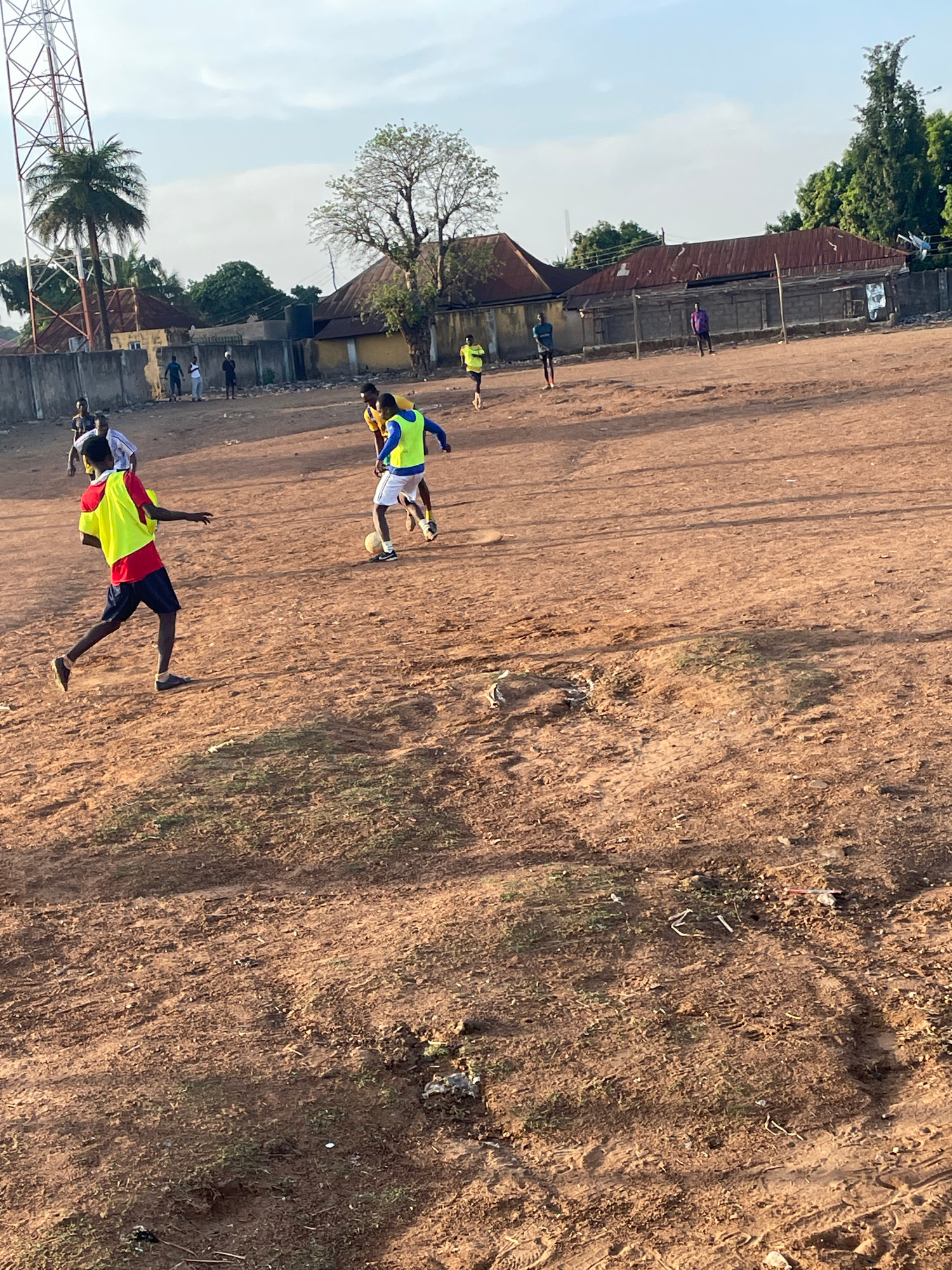 The image shows a dirt field in Akwanga, Nigeria. Two people wearing brightly colored sports vests are on the field. One person is wearing a yellow and red vest with dark shorts, and the other is wear…read more