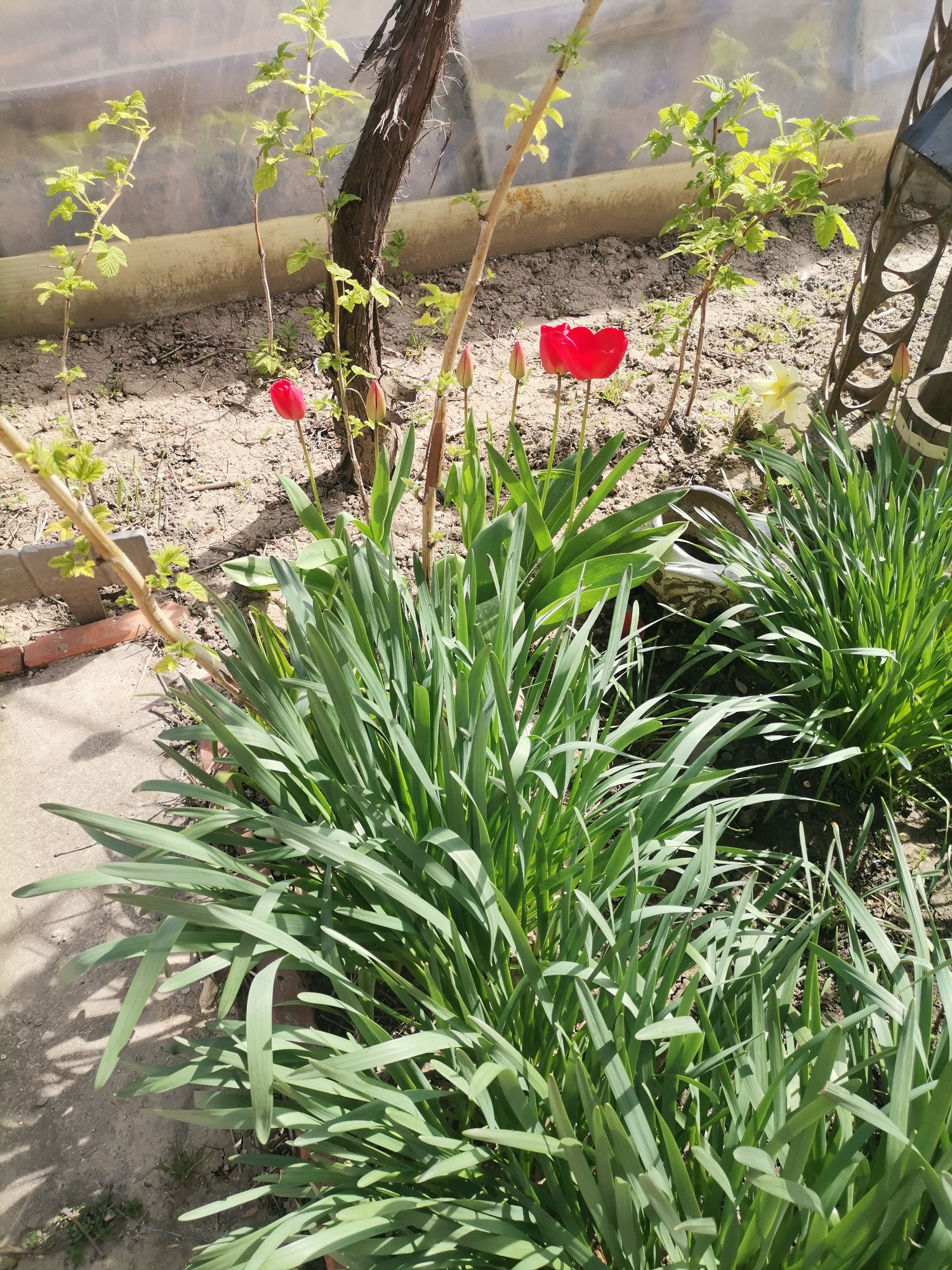 This image presents a vibrant garden scene in Obrochishte, Bulgaria, under bright, clear daylight. The foreground is filled with dense growth of long, strap-like green leaves, likely from ornamental g…read more