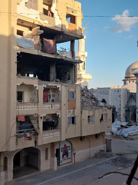 The image depicts a multi-story residential building in Khan Yunis, Palestinian Territory, exhibiting extensive structural damage. The upper three floors are largely destroyed, with external walls blo…read more
