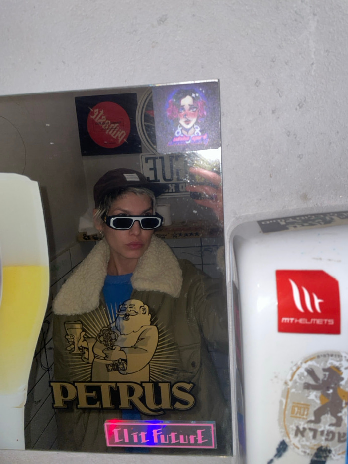 A reflective surface displays a person in sunglasses and a cap, wearing a jacket with a cream-colored collar. The reflection also shows various stickers: a woman with red hair and a sparkly background…read more