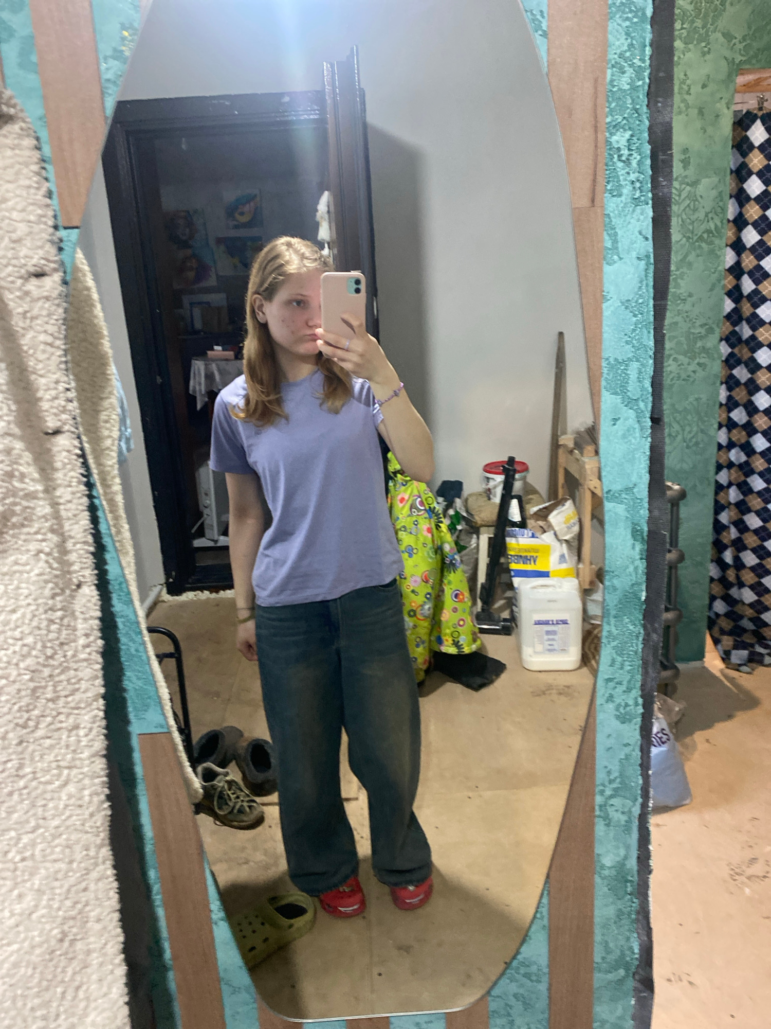 A reflection in a large oval mirror depicts a woman taking a selfie with a pink phone. She is wearing a light purple t-shirt and dark jeans with red shoes. The reflection reveals part of a room: the f…read more